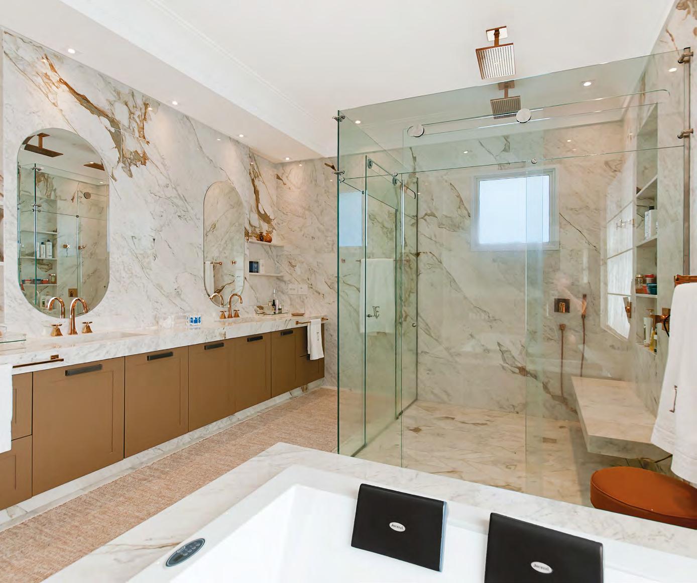 Na sala de banho, móveis sob medida da Kitchens, piso, paredes, bancada e banheira revestidos em Mármore Nuvolato Michelângelo (Stone Center), metais Red Gold da Ornamentare, espelho da Vidroglass e persiana Romana da Loja Nova