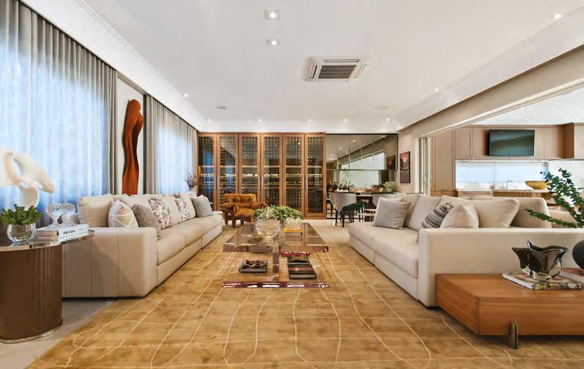 A fachada com linhas clássicas revela uma casa imponente, com ambientes amplos para o casal e seus quatro filhos. O objetivo foi criar espaços fluidos que facilitam a rotina da família, como na área social, com adega e espaço gourmet que leva à piscina. Na ala íntima, soluções personalizadas para cada morador, incluindo uma sala de TV despojada, onde todos se acomodam com conforto.