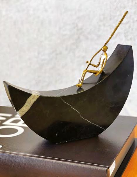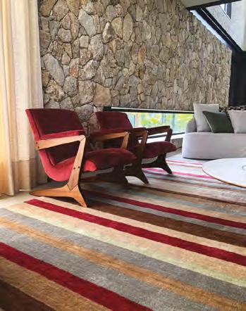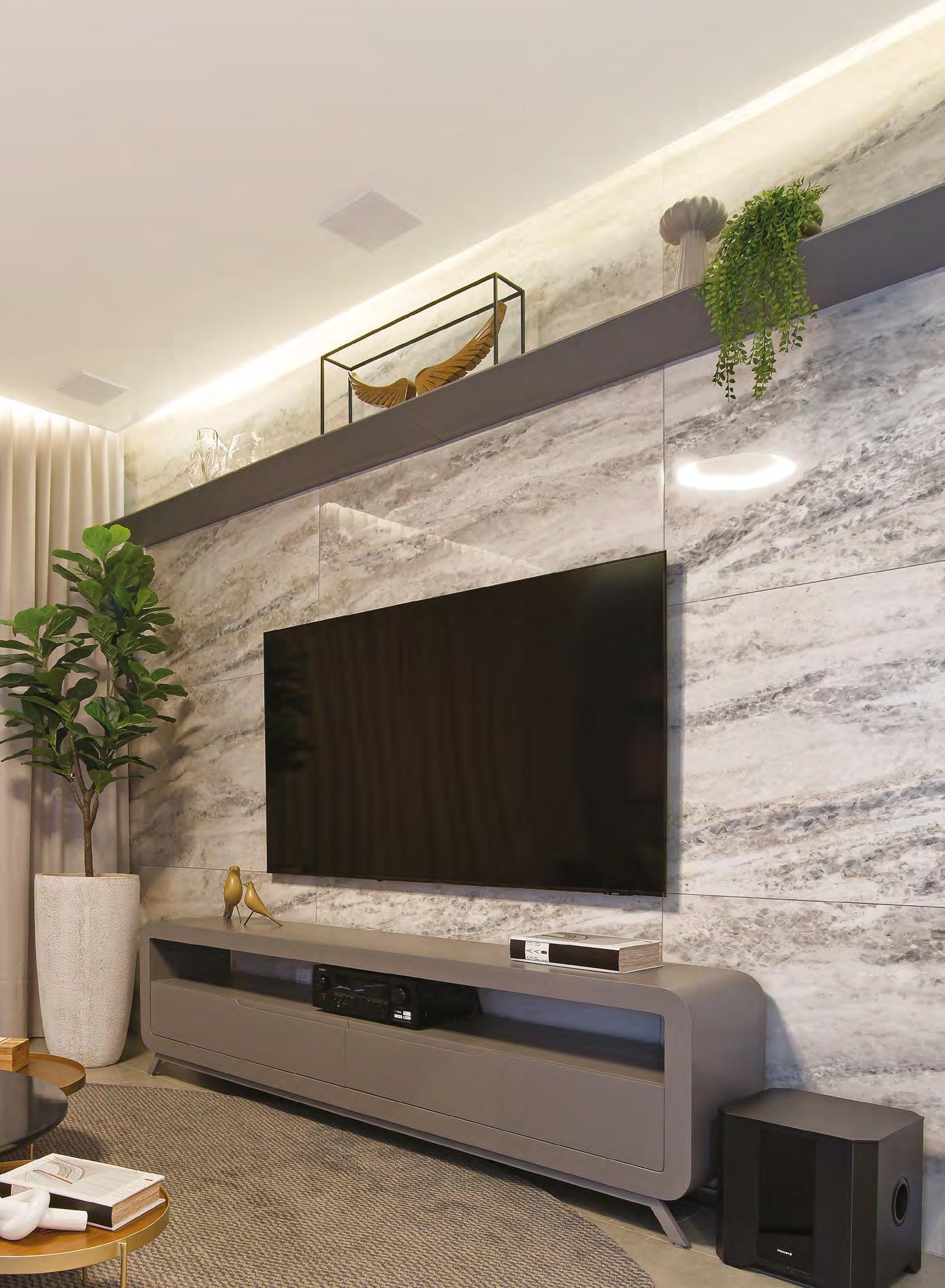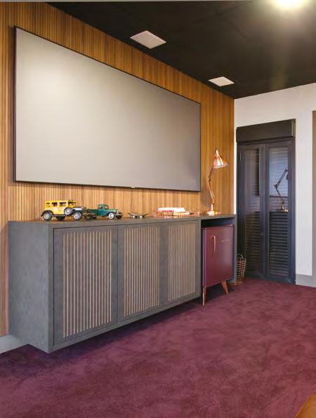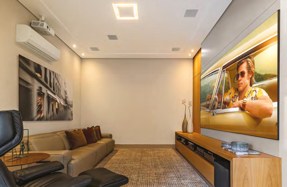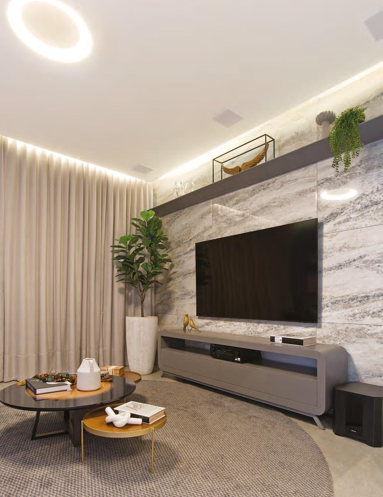 Acima, o home theater é ideal para reunir a família no generoso sofá, com telão de 150” para projeção de filmes e sistema de som surround (G-Easy Automação). As paredes em tom neutro servem como base para a marcenaria (LHD Móveis por Sara Melissa) com painel amadeirado. O tapete da Punto e Filo (Perfil Casa) tem padronagem que remete à natureza, enquanto os quadros e decorações agregam a personalidade dos clientes. A iluminação é da Ilumicorp, com projeto luminotécnico do Espaço Simplifique. Na página ao lado, na fachada, o visual contemporâneo ganha a cena a partir da pedra madeira rosa amolfadada, que combina perfeitamente com o paisagismo assinado por Renata Kassis, do Studio Átrio e a escultura de autoria do artista riopretense Rubens Andaló. Os degraus de acesso são em caco e o piso externo em Mármore Travertino, fornecido pela Cotrimex. O projeto teve execução, gerenciamento e acompanhamento da Vollet Engenharia, do engenheiro Fabio Vollet