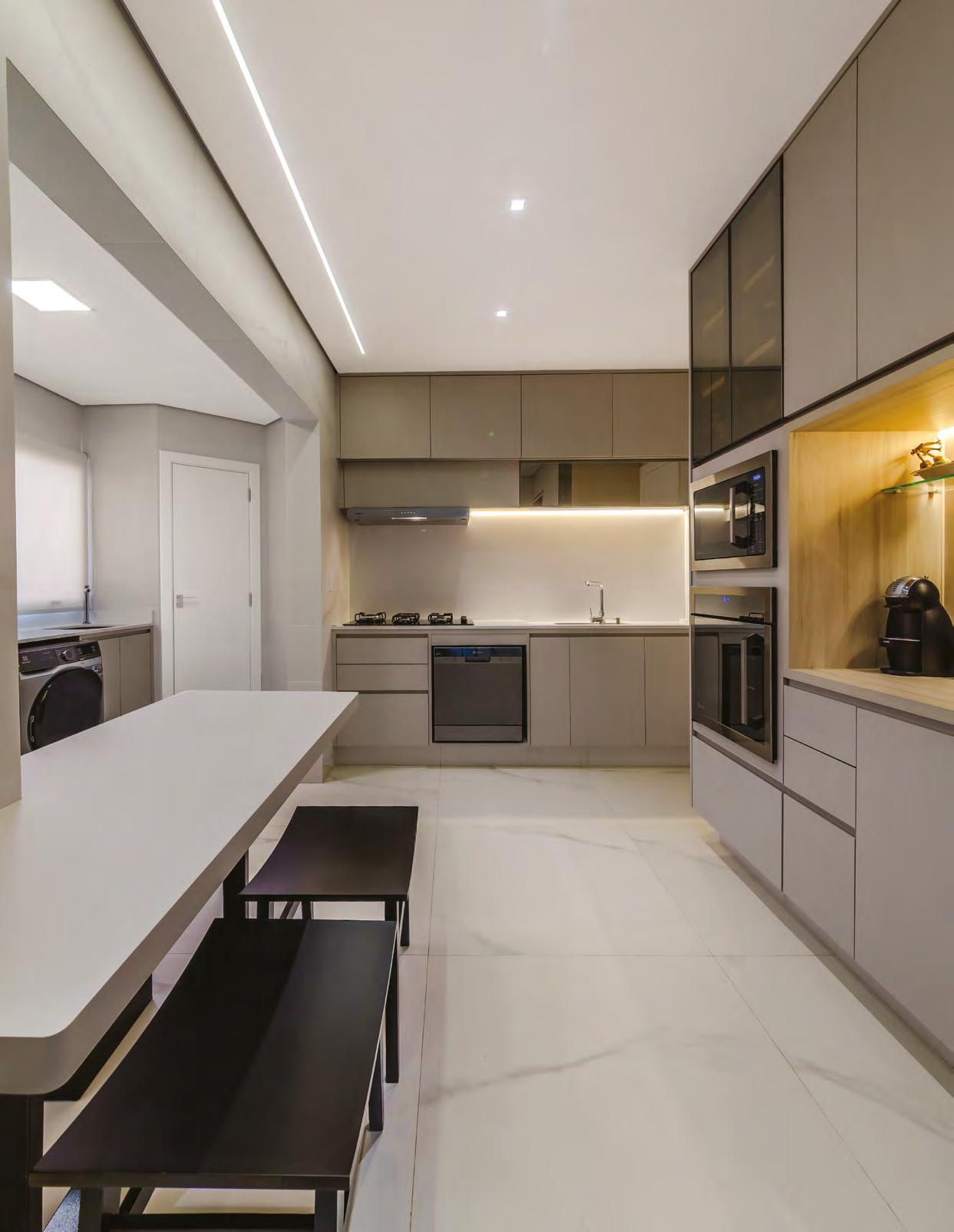 Acima, sala de jantar e TV com mobiliário contemporâneo em tons neutros. O piso foi mantido original, mas as paredes ganharam nova pintura (São Geraldo Tintas), com destaque para as boiseries (Gesso Livre). A climatização ajuda a manter o conforto do ambiente. No gesso (Gesso Livre), a iluminação (Ataluz) evidencia os elementos e as cortinas de tecido (Desilux) finalizam a composição. A marcenaria inclui o painel amadeirado do home e os móveis da cozinha, em tons de cinza. Na página ao lado, a cozinha, agora integrada com a antiga área de serviços, conta com uma nova mesa para refeições. Bancadas em Quartzo Branco (Marmoraria São Jorge) completam o espaço