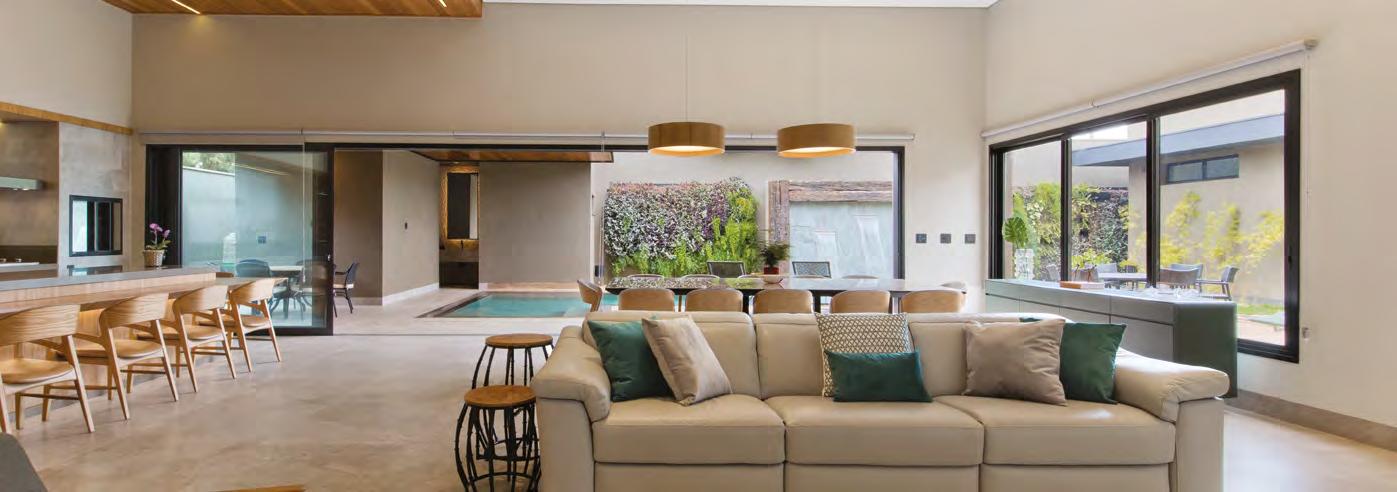 ELISA VASCONCELOS Os ambientes integrados simbolizam a busca pela praticidade na rotina, nesta casa que se conecta com o exterior a partir das amplas esquadrias de vidro