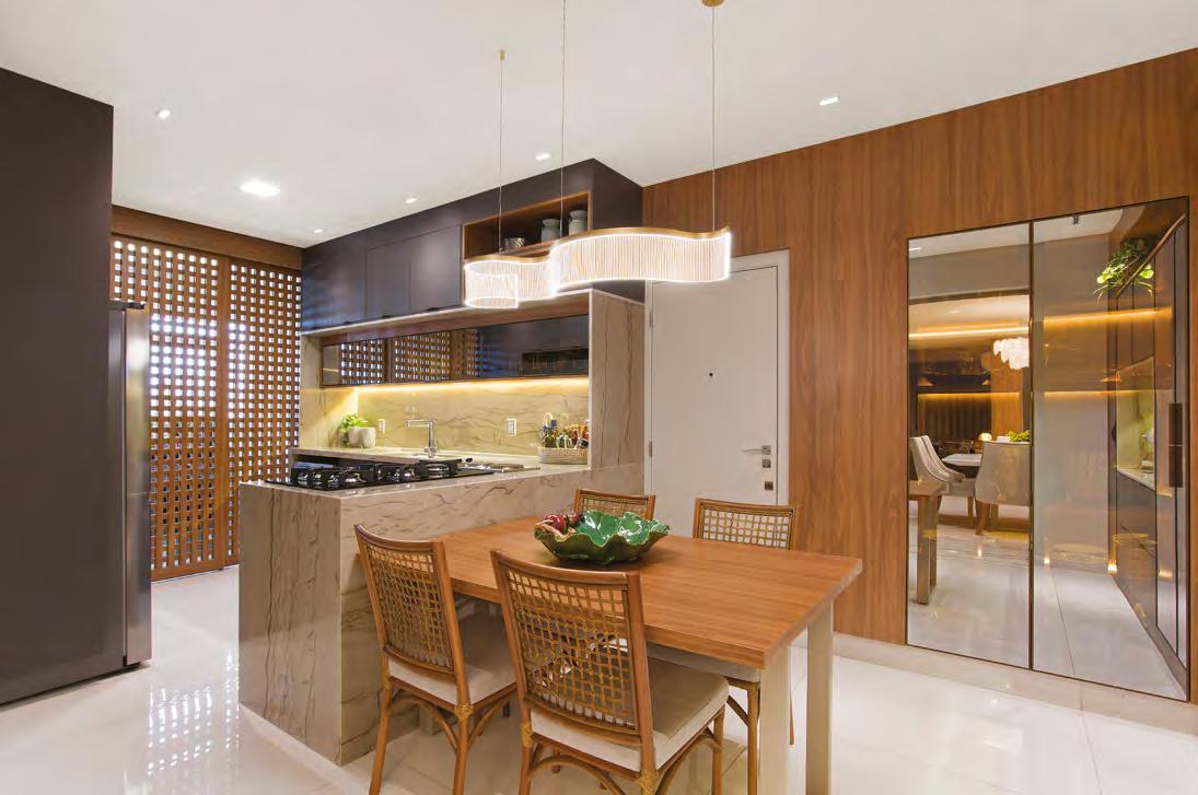 A sala de estar projetada em tons terrosos, com poltronas Lina da Líder Interiores (Perfil Casa) ganhou tapete e mobiliário atemporal como o sofá, as mesas de centro e a mesa de jantar com cadeiras, tudo da Mobília 22. Ela se conecta com o espaço gourmet em um ambiente único, com painel e pisos em lastras da Roca e iluminação (Cielaluz Iluminação) que permite criar diferentes cenários. Para completar, marcenaria sob medida da Celmar Rio Preto