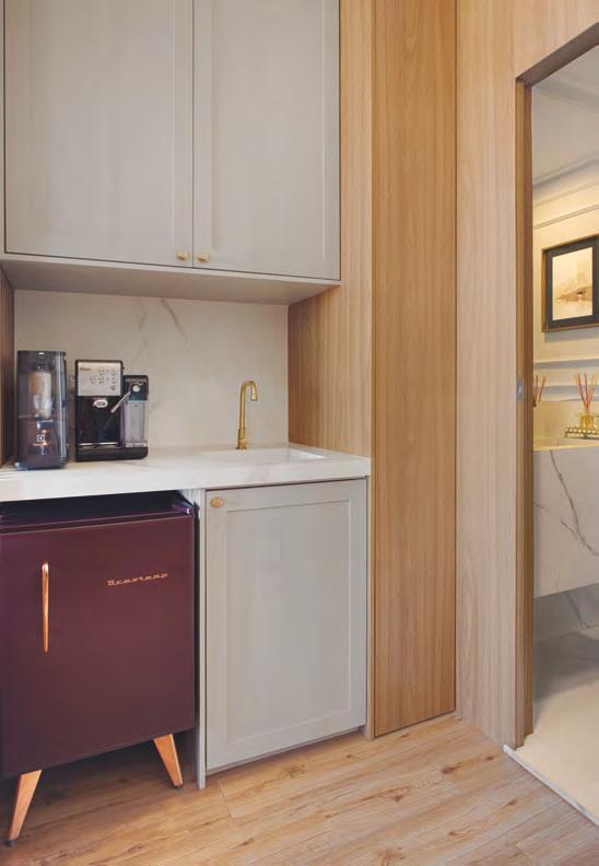 Acima, a escrivaninha com painel ripado cinza (HR Planejados) complementa o espaço de trabalho, com armários e gaveteiros no estilo provençal e poltronas (P.O. Móveis e Decorações). O gesso recebeu luminárias da CielaLuz, que forneceu também as arandelas decorativas. Para controle da luminosidade, as janelas têm persianas. Na segunda foto, a copa equipada com cafeteira e frigobar tem bancada esculpida em porcelanato marmorizado (Casa dos Construtores). A peça se estende até a parede, a torneira dourada favorece a composição junto aos armários sob medida. Ao fundo, o lavabo separado pela porta camuflada no painel de marcenaria, recebeu boiseries com pintura cinza e quadro com molduras