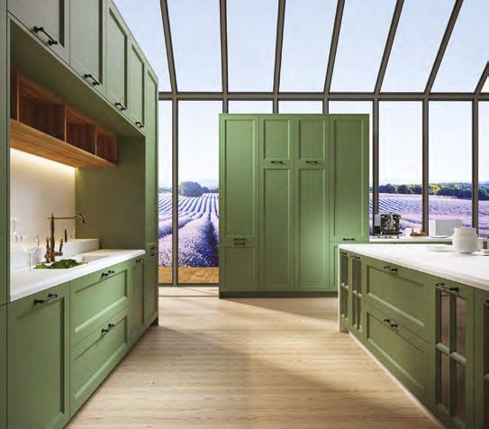 Acima, a marcenaria (Celmar Rio Preto) transita entre diferentes estilos, com destaque para a cristaleira com portas de vidro, na primeira foto, e a cozinha provençal na cor verde com bancada em Super Nano (Marmoraria Carrara) e metais da Ornamentare, na segunda foto. Todo o piso é em lastras da Roca inclusive na bancada do lavabo, na terceira foto. Nele, destaque para o papel de parede. A iluminação é da Cielaluz Iluminação