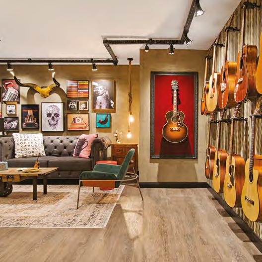 Acima, um painel de madeira recebe a logomarca em letra caixa e serve como fundo para o mobiliário. O carrinho bar, o banco (ambos da Perfil Loft) e as decorações (Armazém Antiguidades), criam um cantinho ideal para fotos. A iluminação (NR Iluminação) inclui trilho de spots e luminária de chão para destacar os elementos e o piso de vinílico (Casa dos Construtores) aquece, em todos os espaços. Na página ao lado, o visual despojado inclui quadros coloridos (Urban Arts), móveis soltos que transitam entre o clássico e o contemporâneo. A poltrona verde e o tapete são da Perfil Loft. As paredes em gesso acartonado contribuem no isolamento acústico e para dar acabamento revestimento de cimento queimado da Suvinil (Dantecolor). As guitarras e os violões ficam em evidência nas paredes. As decorações são da Armazém Antiguidades. Na iluminação, trilho aparente de spots e luminária pendente de corda, da NR Iluminação