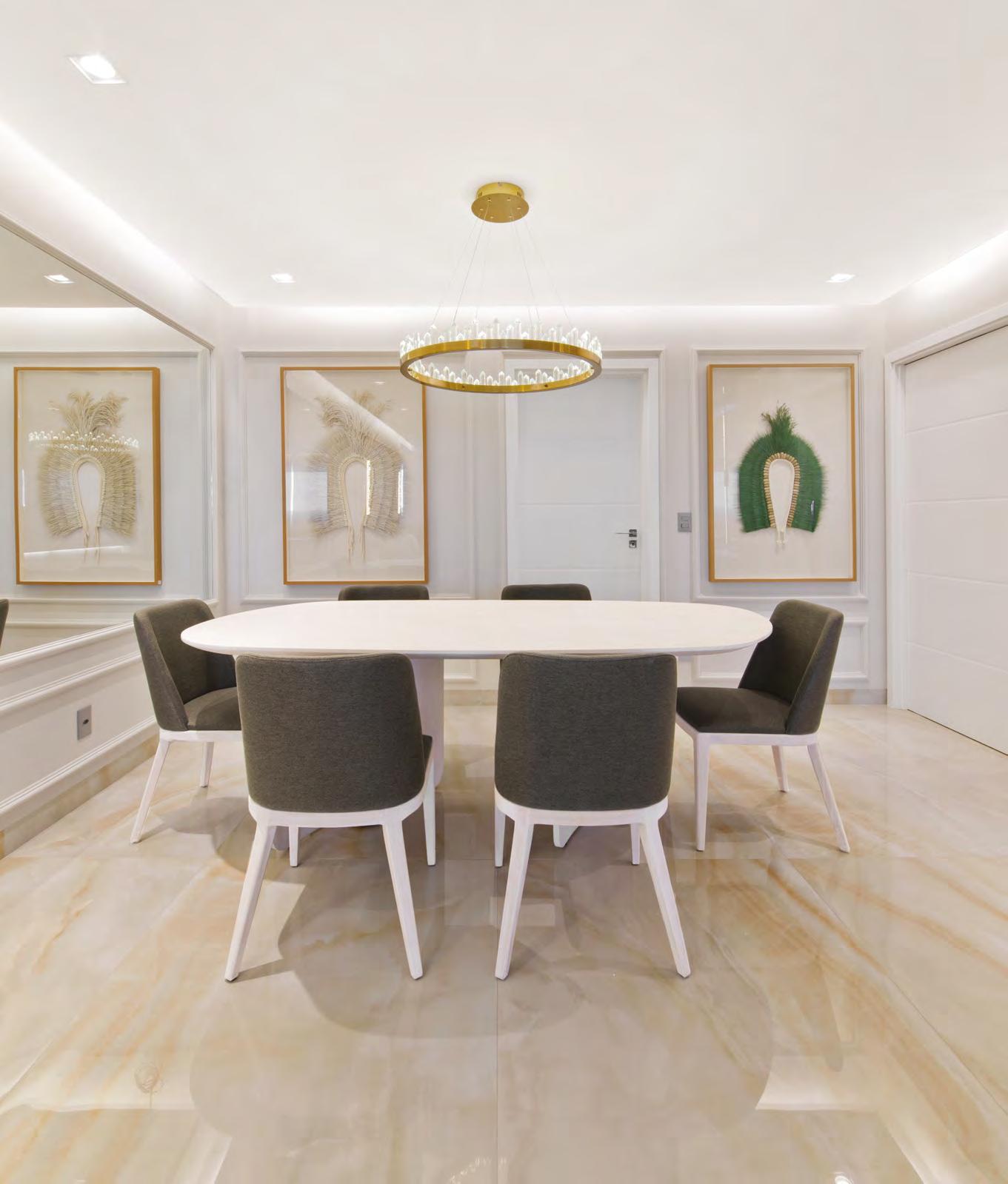 A sala de jantar com piso em lastras da Roca combinando com os tons do ambiente, que tem mesa com cadeiras e quadros da Mobília 22, tudo isso iluminado pelo lustre com detalhes em dourado (Cielaluz Iluminação)