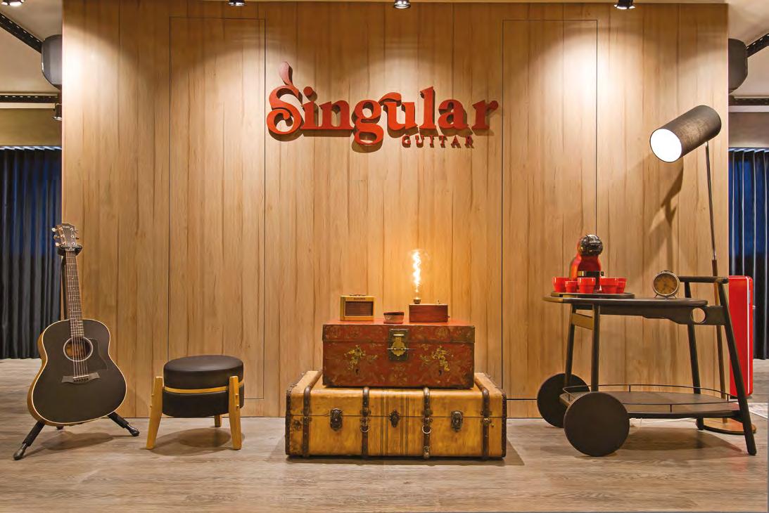 O cliente nos solicitou a integração de duas salas para montar sua loja com estúdio de música. Ele queria ambientes instagramáveis, então utilizamos um conceito mais industrial, que passeia entre o clássico e o contemporâneo, sem esquecer do isolamento acústico adequado. Por isso, as paredes de gesso acartonado receberam textura de cimento queimado, evidenciadas pelos trilhos.