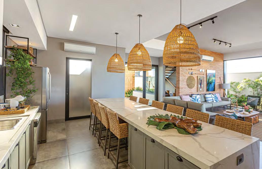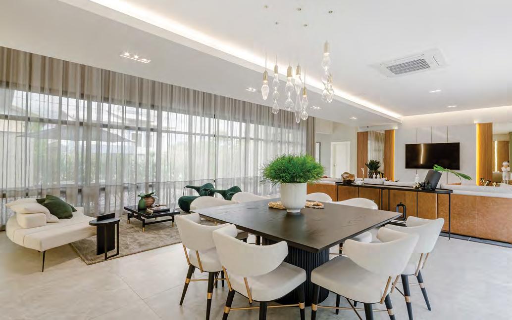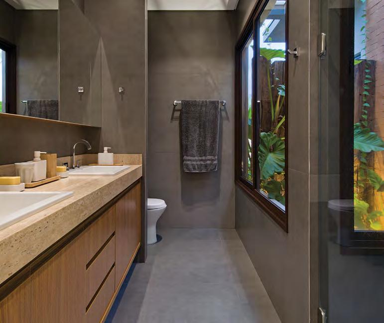 “Com foco na integração familiar, este projeto possui ambientes amplos e confortáveis. A composição se volta ao bem viver dos moradores, desde o mobiliário até os revestimentos e o paisagismo, que se sobressai em todos os detalhes. Pensamos em uma arquitetura que conversa com o entorno, utilizamos revestimentos nobres e amplas aberturas com o intuito de valorizar a natureza e a luminosidade natural.”