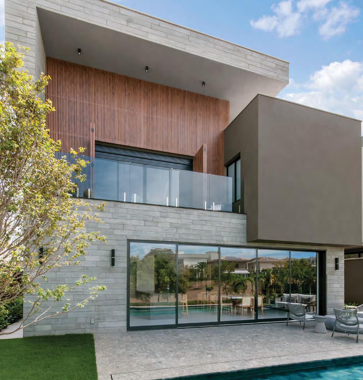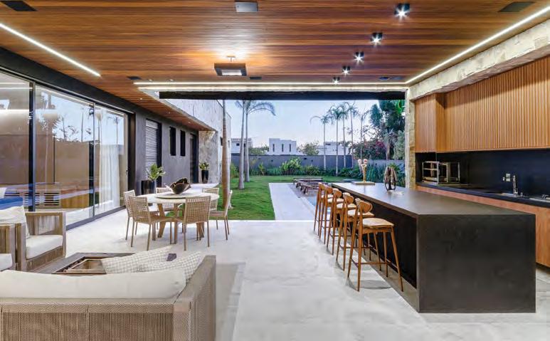Acima, o uso do alumínio na estrutura do pergolado, nas aberturas de vidro dos ambientes, nos brises e forros amadeirados permite a entrada de luz natural no projeto. Os acabamentos incluem a aplicação da pedra Hijau da Lantai na piscina, spa e parede, bem como o uso de piso em porcelanato da Mosarte em toda a casa, ambos da Studio Porto Acabamentos Finos. O paisagismo é da Pessuto Paisagismo. Na foto ao lado, no espaço gourmet, destacam-se as bancadas e a ilha em Dekton, da Litoral Mármores e Granitos, a churrasqueira, as banquetas e os revestimentos Mosarte da Studio Porto Acabamentos Finos. A iluminação da casa é fornecida pela Tok Iluminar, incluindo os lustres de design. O sistema de ar condicionado embutido é da Poloar Bertioga. Na sala de jantar, a marcenaria sob medida da Segatto e as cortinas em tom terroso completam o espaço, com poltrona que permite contemplar o visual externo