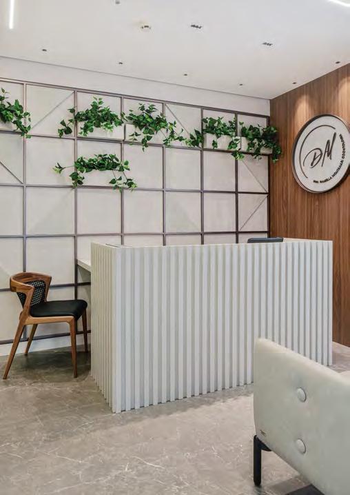 Acima, à esquerda está o lavabo, com textura em pedras de cristal branca Luxo (Tintas Collors) e revestimento 3D da Castelatto (Revest Decor) nas paredes. O espelho oval é da Serralheria Artvale, assim como o detalhe em alumínio champanhe na bancada esculpida em quartzo branco. A iluminação (Studio S Iluminação) pontua com delicadeza o ambiente, assim como na recepção, acima à direita e na página ao lado, que tem luminárias embutidas no gesso. Destaque para o painel vazado em ferro (Serralheria Artvale), que envolve os revestimentos 3D da Castellado, encontrados na Revest Decor, que também forneceu o piso em porcelanato com efeito marmorizado. A marcenaria sob medida tem acabamentos claros e efeito ripado no balcão e nas paredes. O painel amadeirado emoldura o logotipo (Serralheria Artvale) do consultório. Para um toque natural, foram utilizadas folhagens suspensas. Com design contemporâneo, os móveis soltos são da Efeito Design