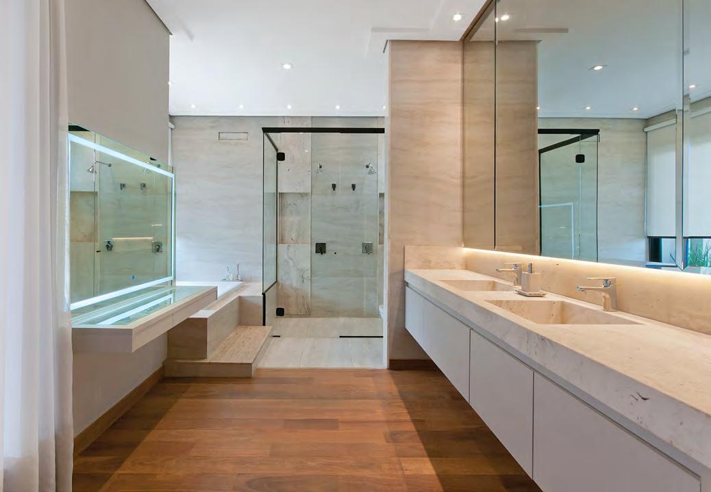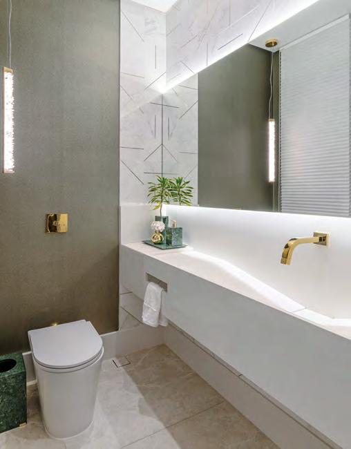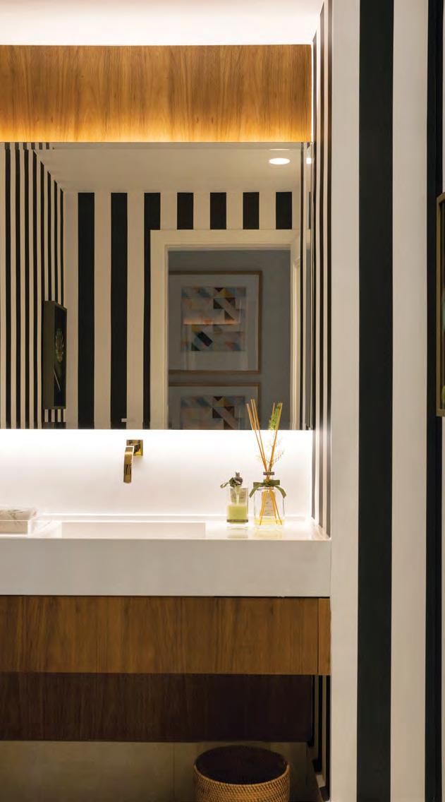 Nesta página, os ambientes íntimos, incluindo a suíte do casal e o dormitório infantil com projeto lúdico, são assinados por Fernanda Scandiuzzi Camacho. A marcenaria sob medida (Segatto) tem padrões neutros e amadeirados, além de um escorregador amarelo protagonista do quarto com temática náutica. O piso de madeira revela um toque de aconchego nos dormitórios e na parede pintura da artista Bia Betan. Toda a iluminação é da Tok Iluminar, inclusive no banheiro, abaixo, com piso e paredes marmorizados, louças da Roca e metais da Rubinettos, tudo da Studio Porto Acabamentos Finos. A bancada em Dekton é da Litoral Mármores e Granitos