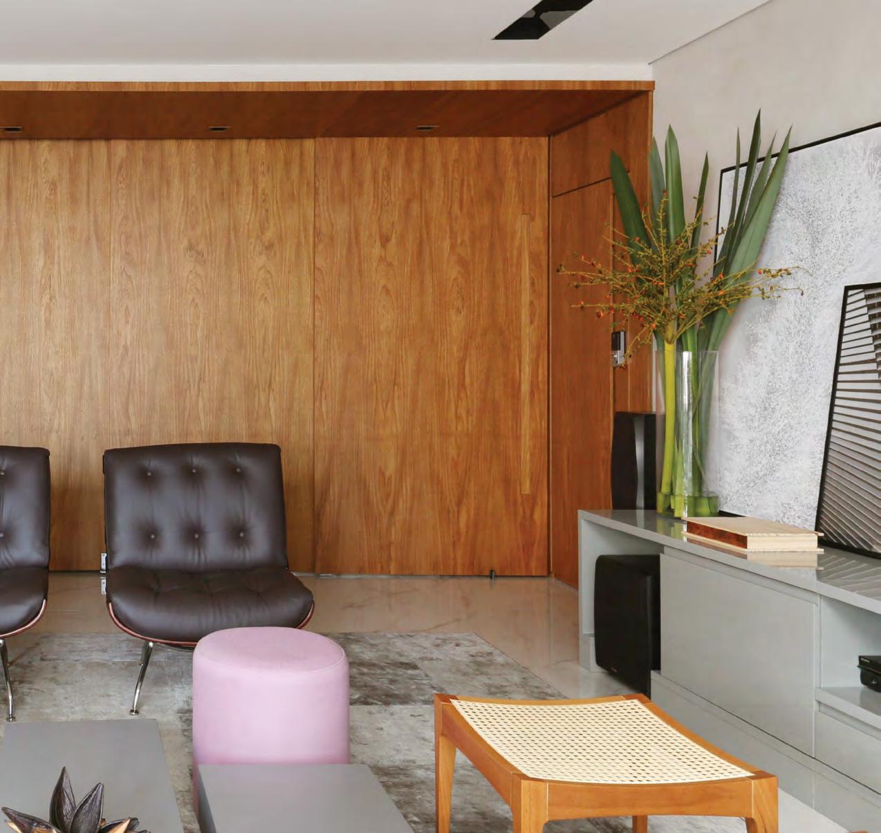 Neste projeto, o painel foi feito em lâmina de madeira natural, o que trouxe muito aconchego e deixou o ambiente mais elegante.