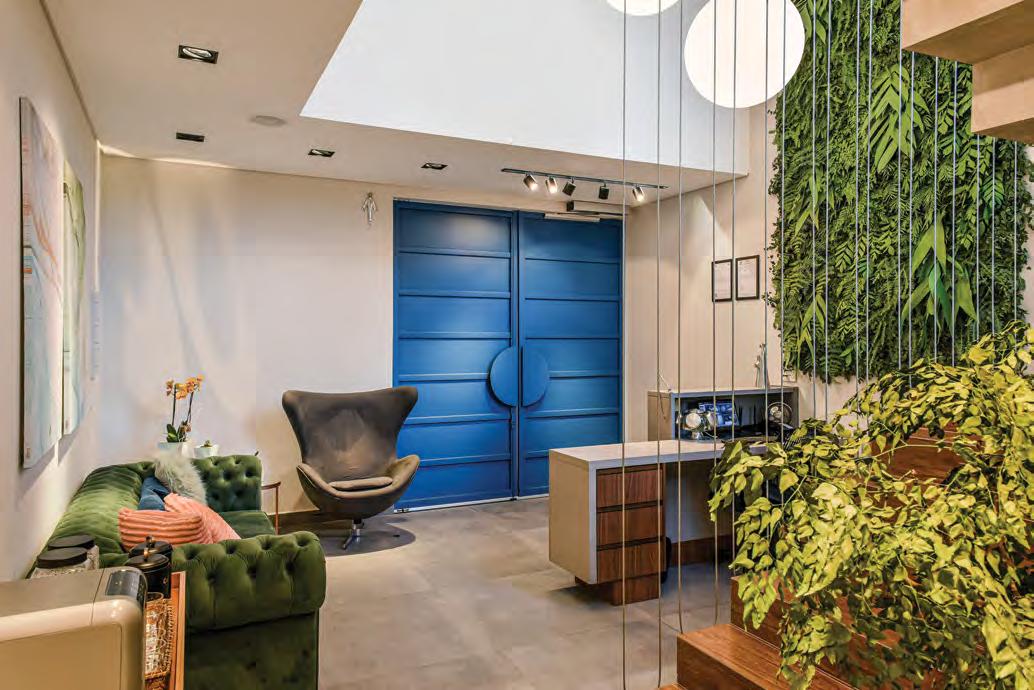 Acima, a recepção tem balcão em marcenaria sob medida (Movelaria Boa Esperança Planejados) e porta em ferro na cor azul desenhada pela arquiteta. O paisagismo enche o espaço de leveza com seus tons de verde, enquanto os spots e os pendentes (Studio S Iluminação) iluminam com personalidade. A escada tem degraus em porcelanato amadeirado (Japonesa Pisos) e guarda-corpo em cabos de aço. No mobiliário, sofá Chesterfield e poltrona Egg. Na página seguinte, a fachada com texturas em tons de gelo e cimento queimado. Os cobogós coloridos na paleta de cores do escritório são o principal destaque