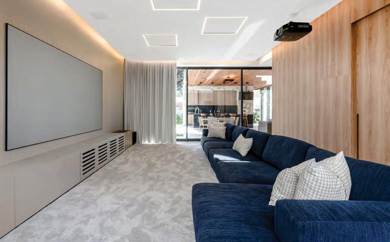 Na foto, o Home Theater contemporâneo com iluminação em LED tem acabamento melamínico amadeirado e pintura na cor Segatto, demonstrando toda a qualidade e inovação que o trabalho representa.