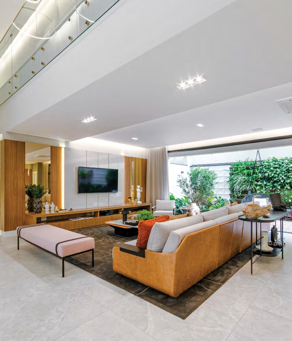 Nesta, o living integrado com pé-direito duplo tem projeto de interiores assinado por Fernanda Scandiuzzi Camacho. As paredes foram revestidas com ripas cimentícias da Colormix (Studio Porto Acabamentos Finos) e o bloco central em mármore serve como painel para a TV. Entre os destaques estão as duas poltronas e o banco preto, que compõem o espaço junto ao sofá cinza claro. A escada tem degraus em Dekton (Litoral Mármores e Granitos)