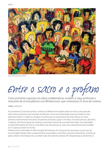 reinventar e foi então que realizou suas primeiras aulas com a artista plástica Luciana Melo. Agora, aos 51 anos de idade, é hora de celebrar as voltas que a vida sempre proporciona. Há décadas longe da burocracia de uma profissão de exatas, ele encontra realização expondo sua arte, tão sagrada e, ao mesmo tempo, tão popular. Não é por menos, afinal sua obra remete a flores, anjos e outras figuras que evocam o consagrado. E é assim que suas pinturas constantemente contrastam a simbologia entre o sagrado e o profano. Isso é evidente nas obras que compõem sua série “Consagrados”. As Santas Ceias associam culturas, contextos e tempos diferentes, sem deixar a espiritualidade de lado. Seja nas andanças pelo mundo ou inspirado pelas tradições populares que encantam e alegram o Brasil, Luiz Bhittencourt prova que a criatividade leva longe. Em suas obras, o cotidiano é abordado de forma a fazer o espectador refletir e ponderar sobre a sua própria história. E, daqui para frente, o artista deseja que sua busca por respostas se traduza cada vez mais em cores e traços inconfundíveis.