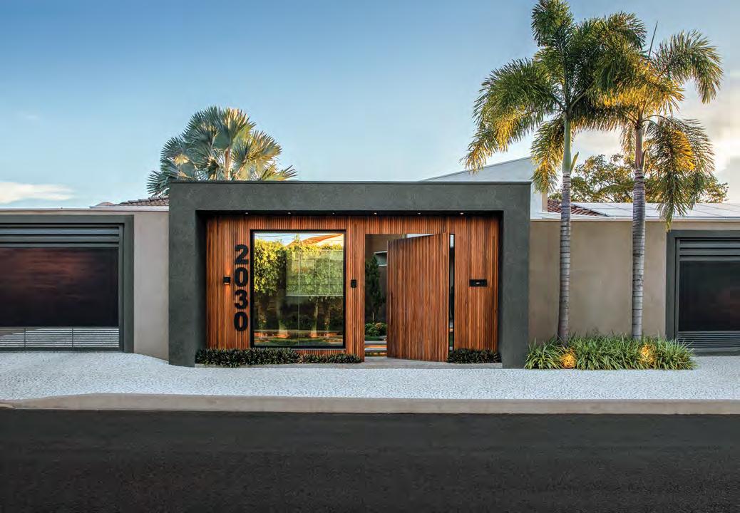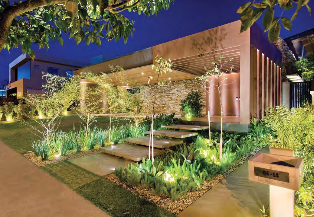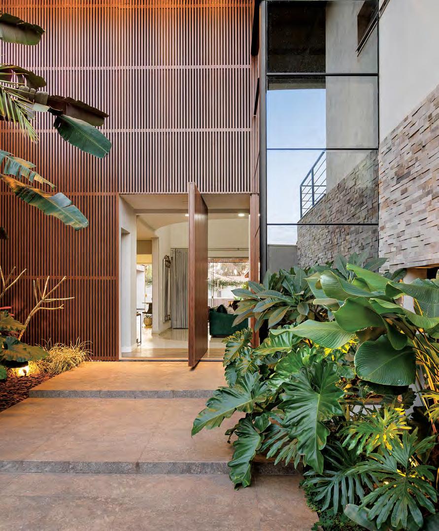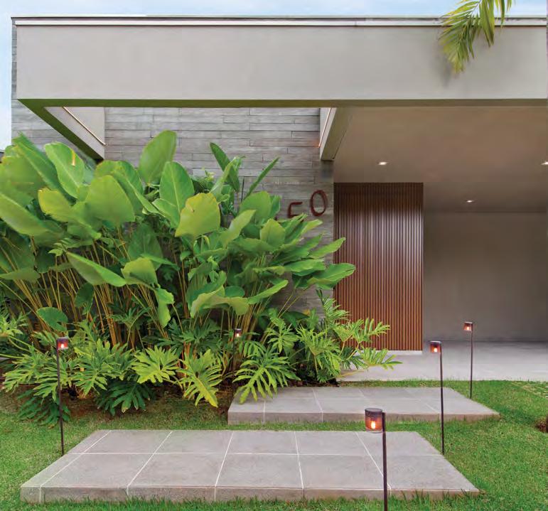 A reforma da casa incluiu a reformulação da fachada, que ganhou tons terrosos e novos revestimentos, como a pedra natural. O paisagismo de Denise Cardoso demarca a entrada e as passagens, no lado de dentro, realçado pela iluminação. A reforma, com obra da SS Angélico Construtores, contou com a substituição das esquadrias, colocação de venezianas e ripados amadeirados tudo em alumínio, além de pele de vidro, fornecidos pela RN Esquadrias. Na segunda foto, detalhe da entrada da casa com piso em porcelanato antiderrapante (Condec Premium)