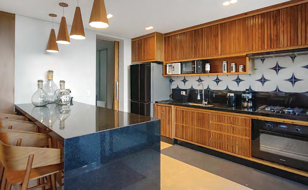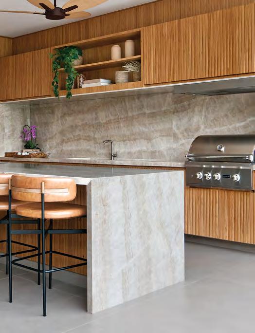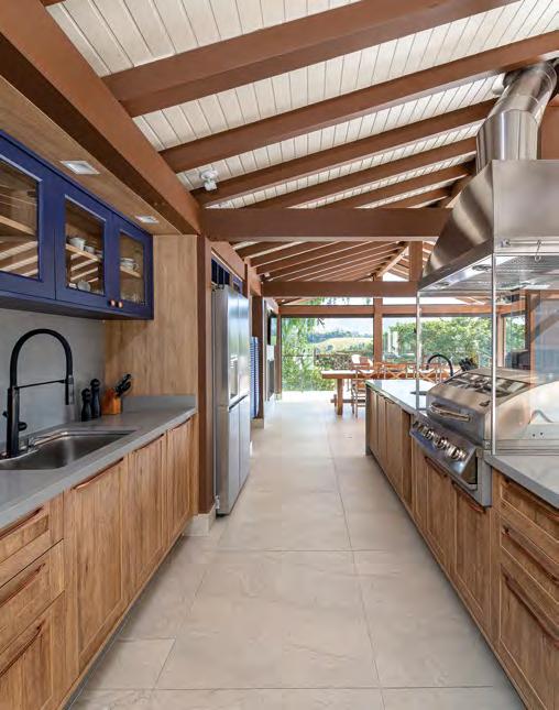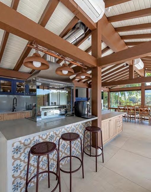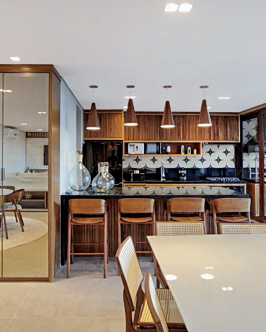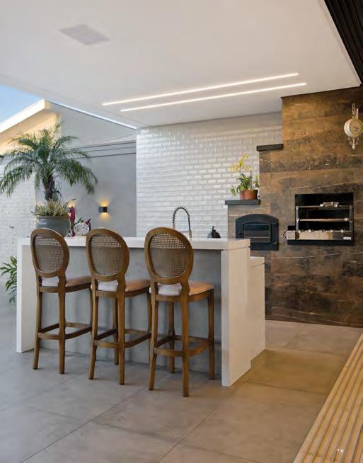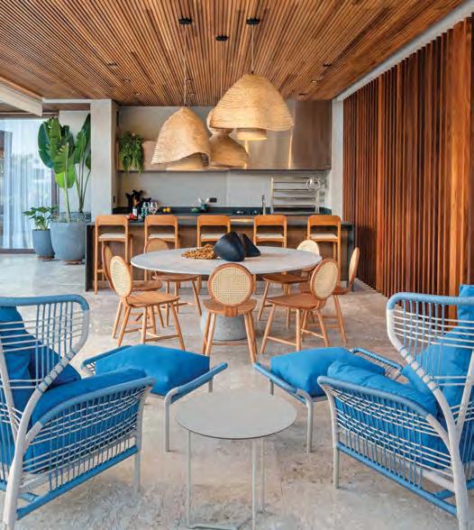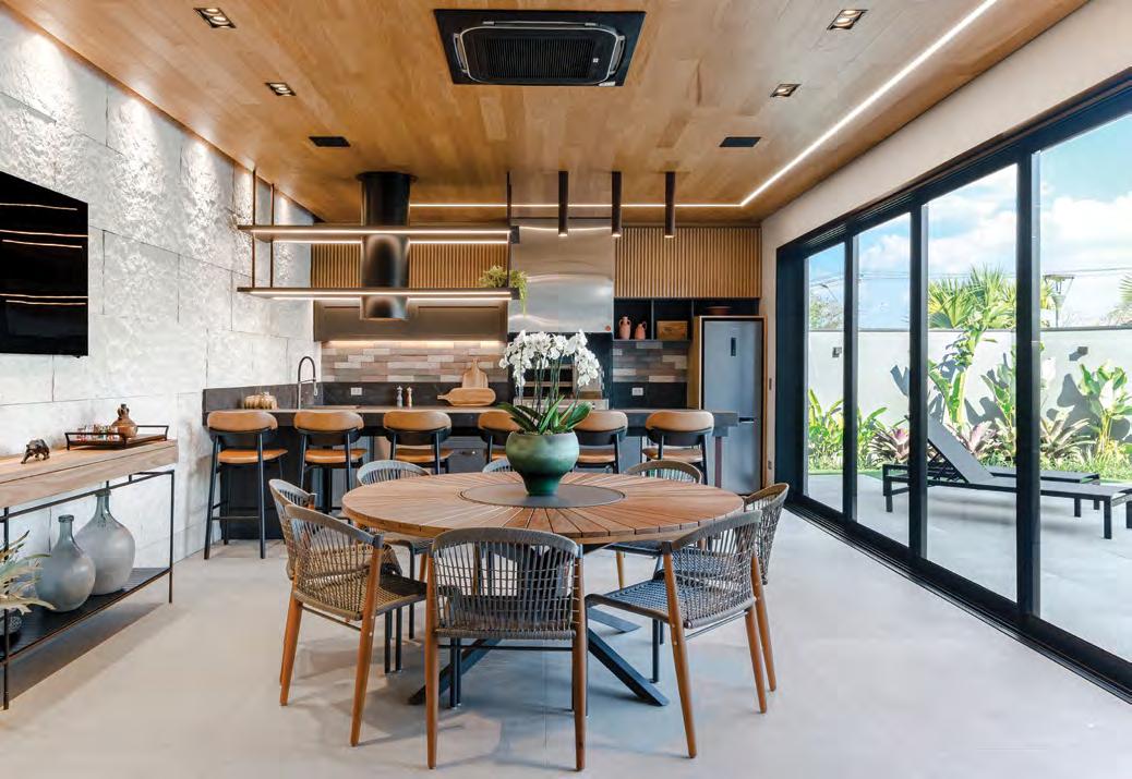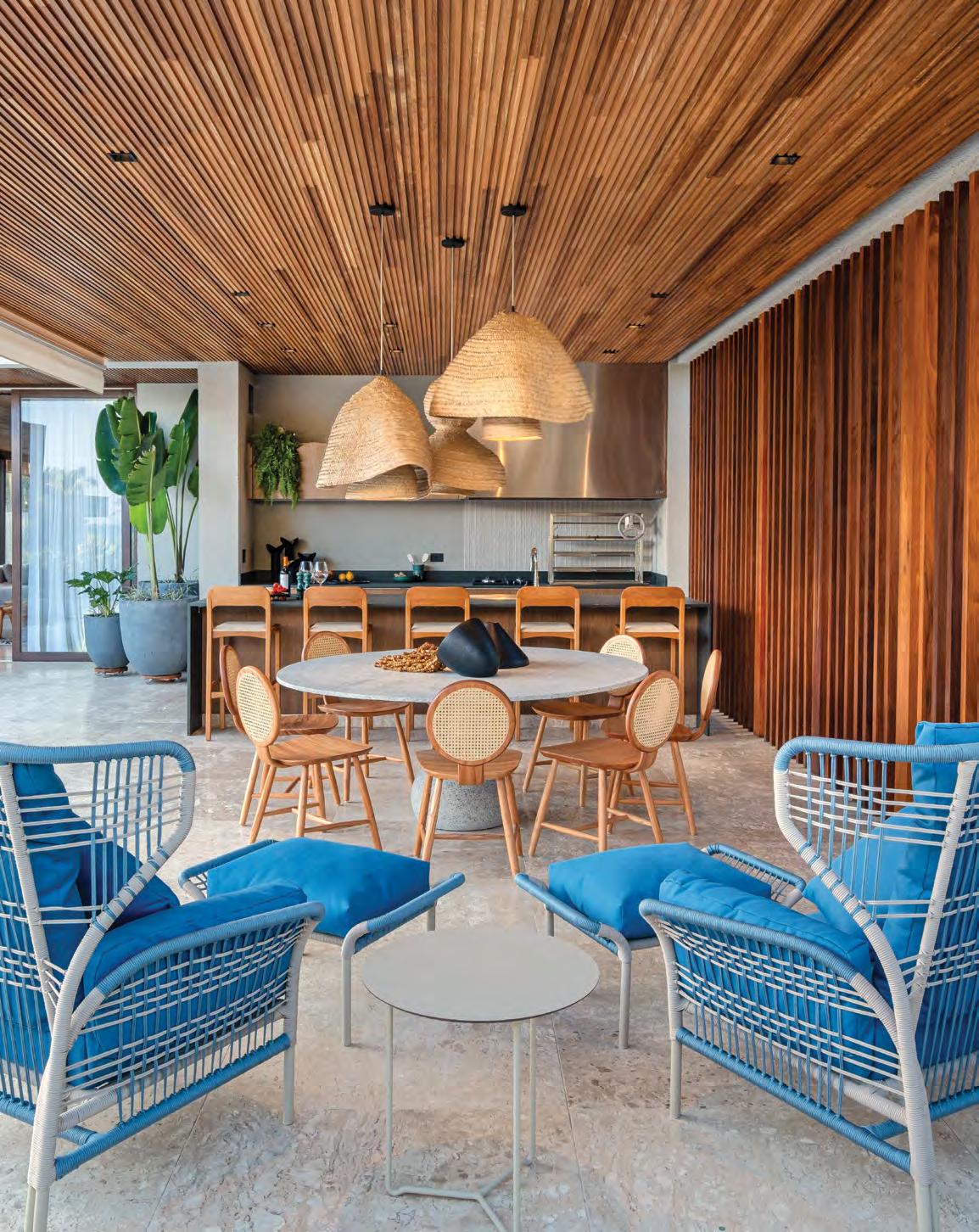 Na varanda gourmet, o piso de Travertino recebe os móveis de design da Firmato Più Esclusivo, que também forneceu o toldo. Sobre a mesa de jantar, os pendentes de palha combinam com as cadeiras com encosto de palhinha e harmonizam com o forro de madeira e com o painel ripado que reveste a parede lateral. A iluminação embutida é da ArqLuce Iluminação. Ao fundo, cooktop da Spazio Eletrodomésticos e Presentes e bancada em Dekton Feroe, da Di Pietra Porcelanatos