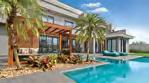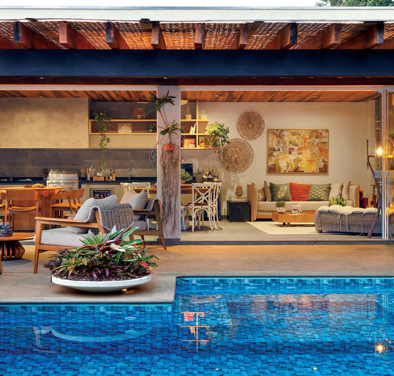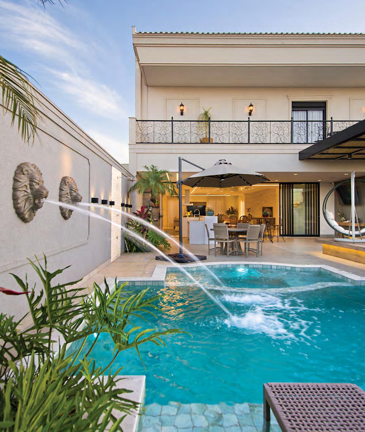 À esquerda, na varanda com forro de madeira e paisagismo por Denise Cardoso estão móveis externos iluminados pelos lustres em fibra natural. Piscina e SPA são equipados pela A Pool Center Piscinas. Nas fotos seguintes, marcenaria sob medida com bancadas de granito preto São Gabriel flameado. O piso, os revestimentos, a cuba e a torneira da Cenox do gourmet são da Condec Premium. A mesa de jantar é da Aimar Móveis. A obra foi executada por SS Angélico Construtores