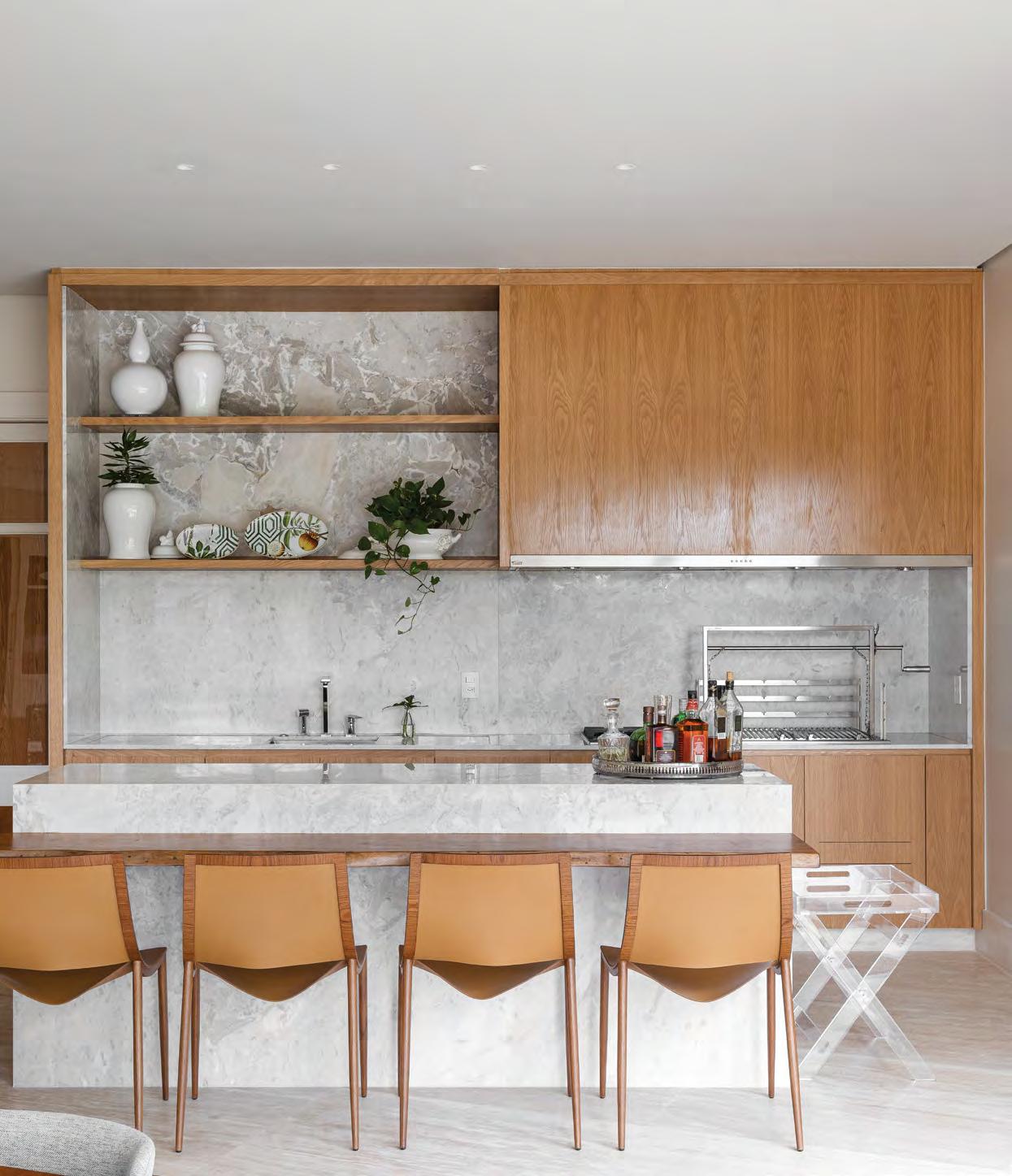 Acima, na primeira foto, a integração da sala de jantar com o living, com mobiliário solto e cortinas da Firmato Più Esclusivo, além de amplas janelas. No projeto, o mesmo piso em Travertino aparece como uma base neutra e contrasta com o forro e os painéis de madeira, em destaque também na segunda foto, no lavabo. O espaço tem, ainda, cuba suspensa da Sabbia e um espelho (Firmato Più Esclusivo) que acompanha a profundidade do ambiente. Em todos os ambientes, as decorações são da Firmato Più Esclusivo. Na terceira foto, na cozinha, em especial, os armários e nichos receberam acabamento neutro e amadeirado, com fogão e coifa da Spazio. As bancadas em Dekton Entzo (Di Pietra Porcelanatos) combinam com o revestimento da parede (Ekológika Revestimentos)