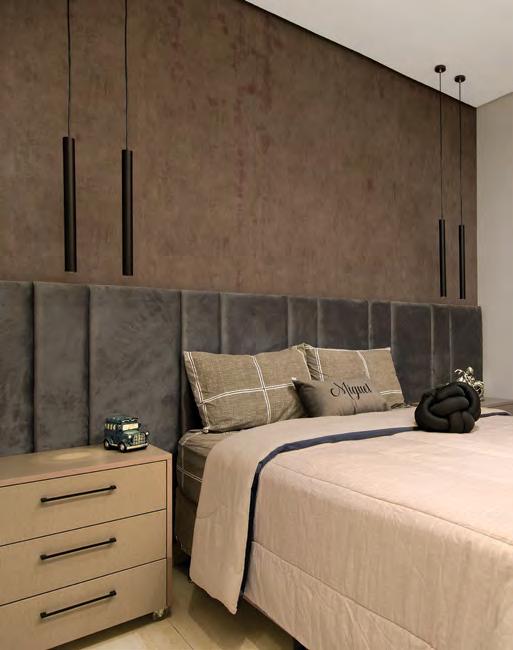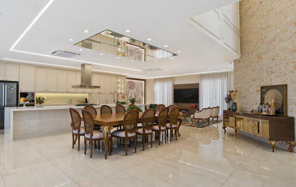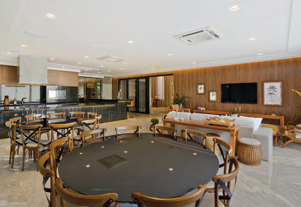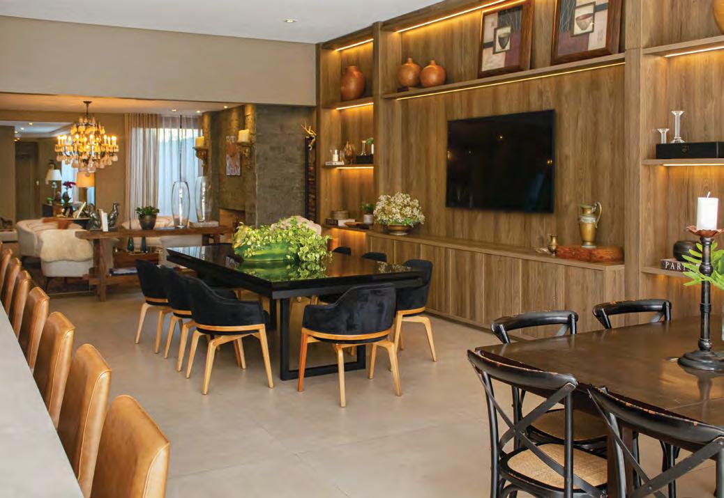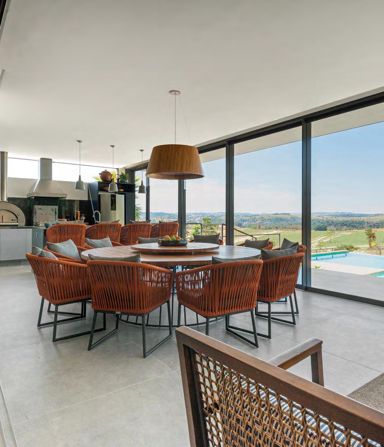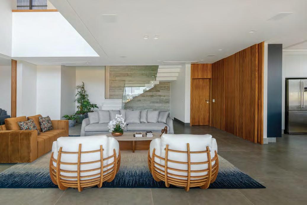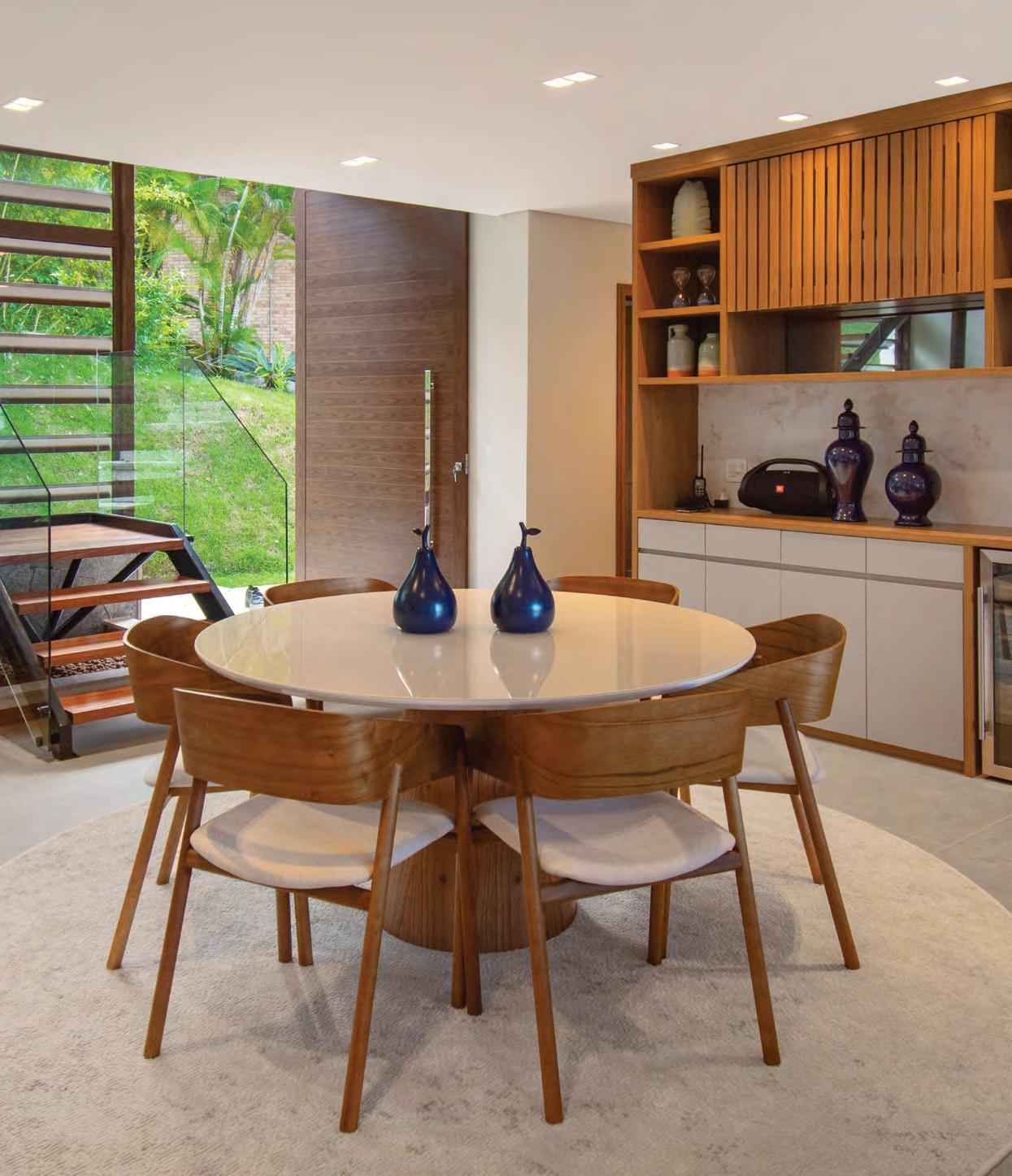 “Esta casa é um reflexo do desejo por dias repletos de bem-estar. Criamos ambientes integrados, para a família aproveitar na companhia dos convidados. Para o aconchego, utilizamos materiais naturais, que revelam um clima rústico sem perder a elegância. Enquanto os espaços sociais estão no térreo, com toque de cor no mobiliário, as suítes estão no pavimento superior, privativas e com projetos personalizados.”