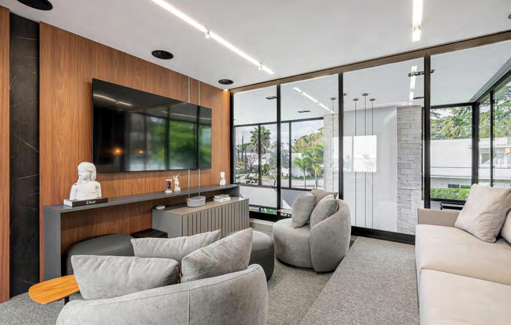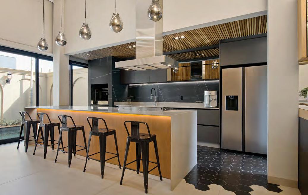 “Com mais de 15 anos de construção, recebi a missão de atualizar essa casa, pensando em soluções modernas para atender às demandas da família. Tudo começou com uma nova fachada, na qual troquei as esquadrias e investi em materiais atemporais, como a pedra natural. Nos ambientes internos, reformulei o layout para dar vida a um espaço funcional, com área de lazer convidativa e aconchegante.”