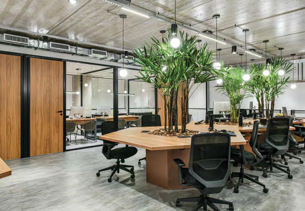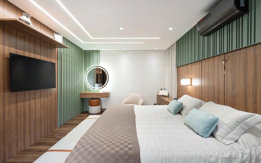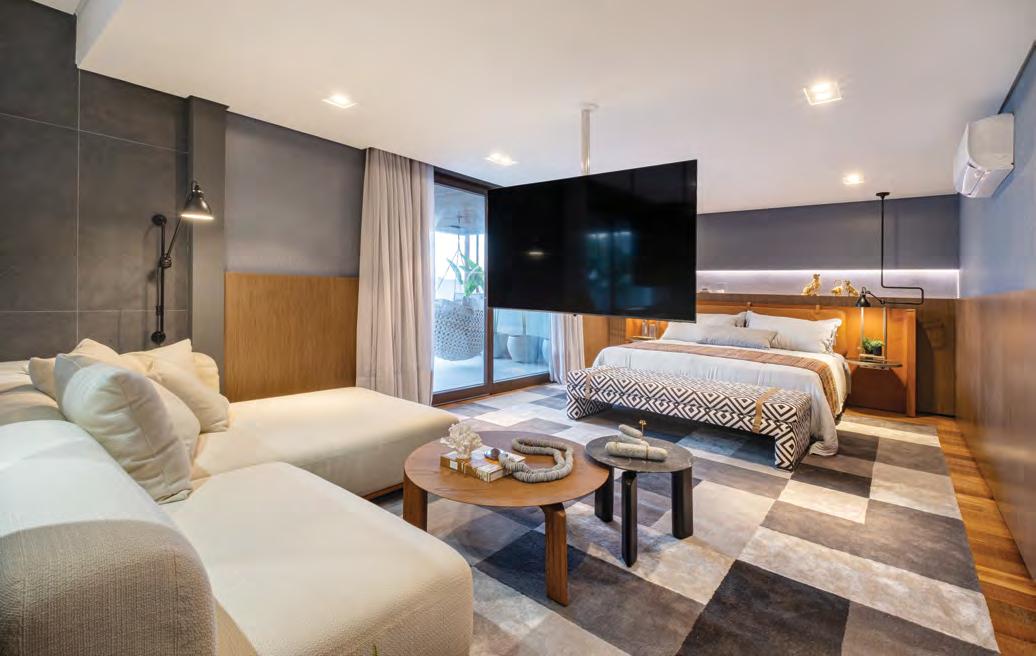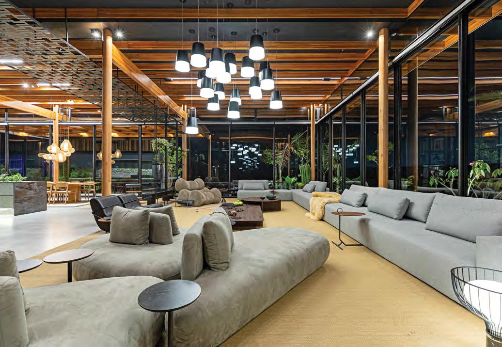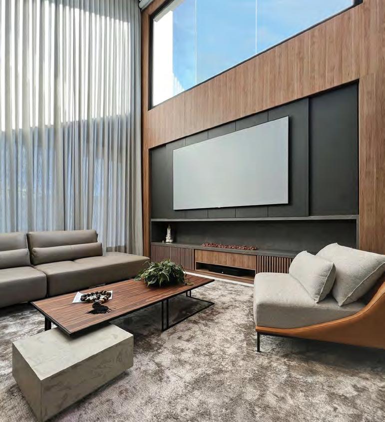 O extensivo uso de vidro Cebrase (Saint Gobain) não só ampliou os espaços, mas também assegurou uma iluminação natural intensa, resultando em menor consumo de energia e ambientes mais frescos devido à ventilação cruzada. Internamente, o drywall, composto por perfis de steel frame da Ananda Metais e placas de gesso acartonado da Saint Gobain (ambos fornecidos pela Topping), proporcionou flexibilidade de design e facilitou instalações elétricas e hidráulicas. Na área social, a combinação do forro acústico e piso vinílico da Tarkett eleva o conforto térmico e acústico. Um projeto nestes moldes pode ser concluído em um período mais curto, proporcionando uma economia significativa de custos e tempo. Para finalizar, a iluminação e as paredes em drywall foram cuidadosamente projetadas pelo arquiteto para evidenciar a estrutura “W”, enquanto o paisagismo de Álvares Tavares enfatiza a sustentabilidade com a valorização da natureza no projeto.
