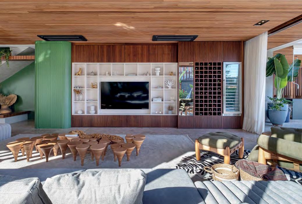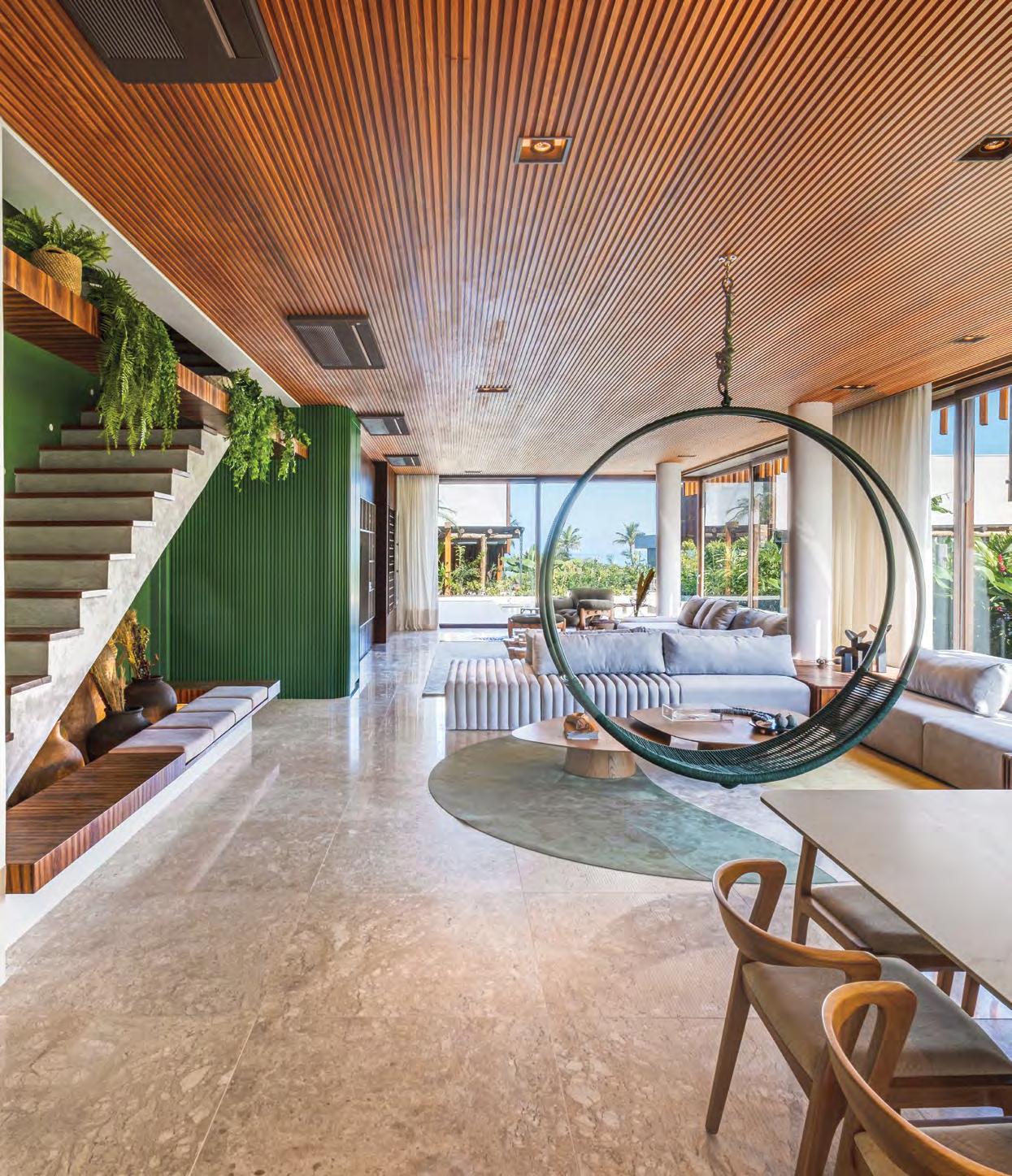 Nesta e na página ao lado, a área social tem piso de Travertino que sugere elegância natural em contraste com as paredes pintadas de verde. O mesmo tom se repete nos painéis ripados de marcenaria, harmonizando com a estante em madeira do home. O mobiliário solto (Firmato Più Esclusivo) inclui peças contemporâneas, como o balanço verde da Tidelli, tapetes e sofás em tom cinza, combinando com os futons escolhidos para o banco de marcenaria sob a escada com estrutura de concreto iluminados em madeira. O forro de madeira recebeu aparelhos de ar condicionado (STR Ar Condicionado) e iluminação embutida (ArqLuce Iluminação). Para o controle da luminosidade, sobre as amplas aberturas de vidro, foram colocadas cortinas de tecido da Firmato Più Esclusivo, que forneceu também os objetos de decoração que complementam o cenário junto ao paisagismo. O projeto de arquitetura é de Gui Matos