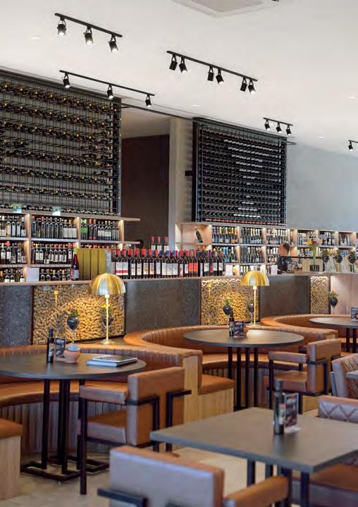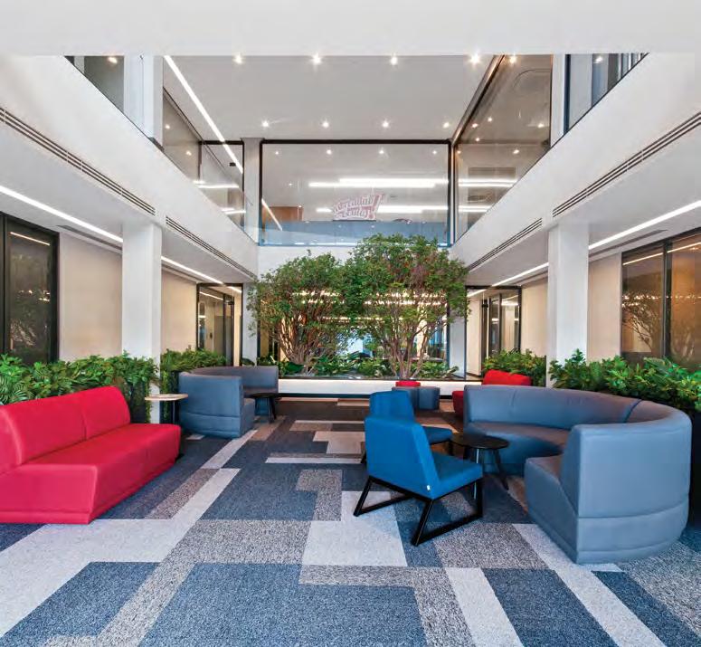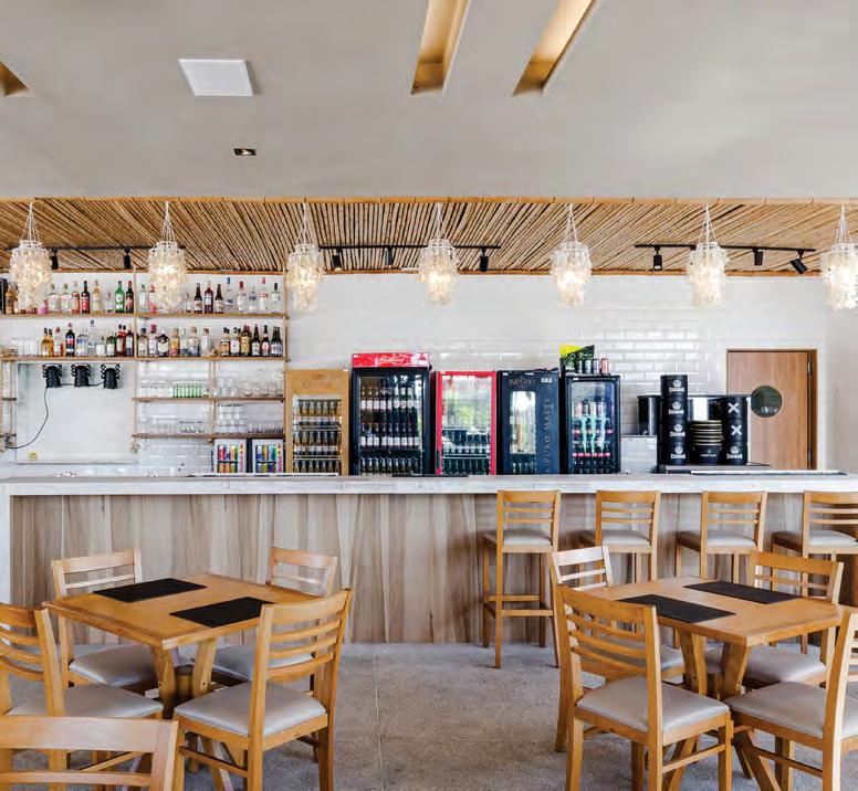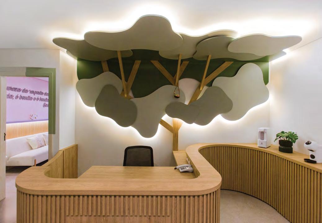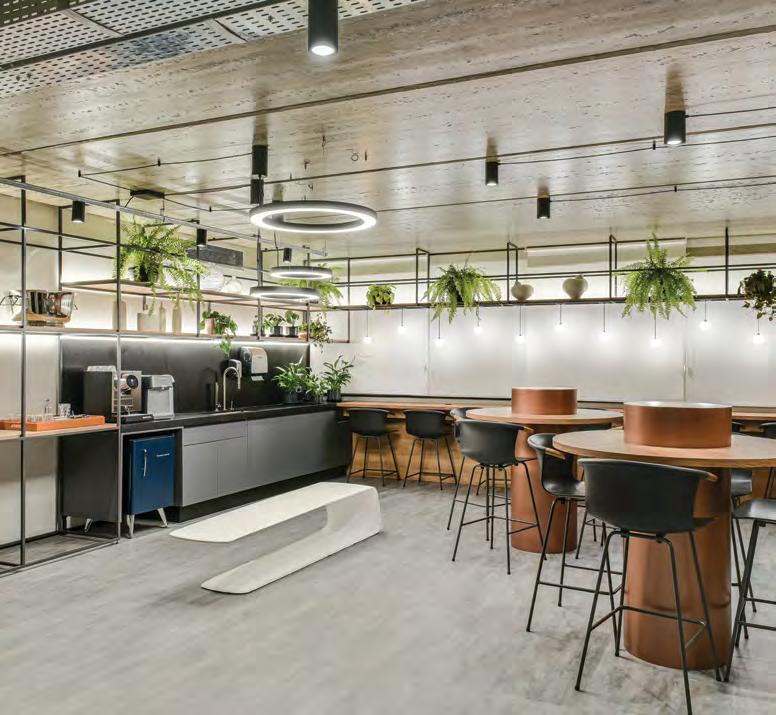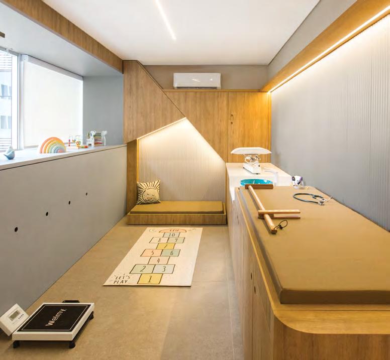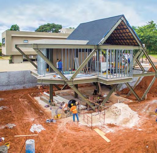 Na página anterior, as diversas etapas da obra foram realizadas em tempo recorde devido ao método de construção a seco. Nesta, os ambientes sociais, onde o uso de drywall, piso vinílico e forro acústico se destacam tanto pela sua acústica quanto pela capacidade de manter a temperatura