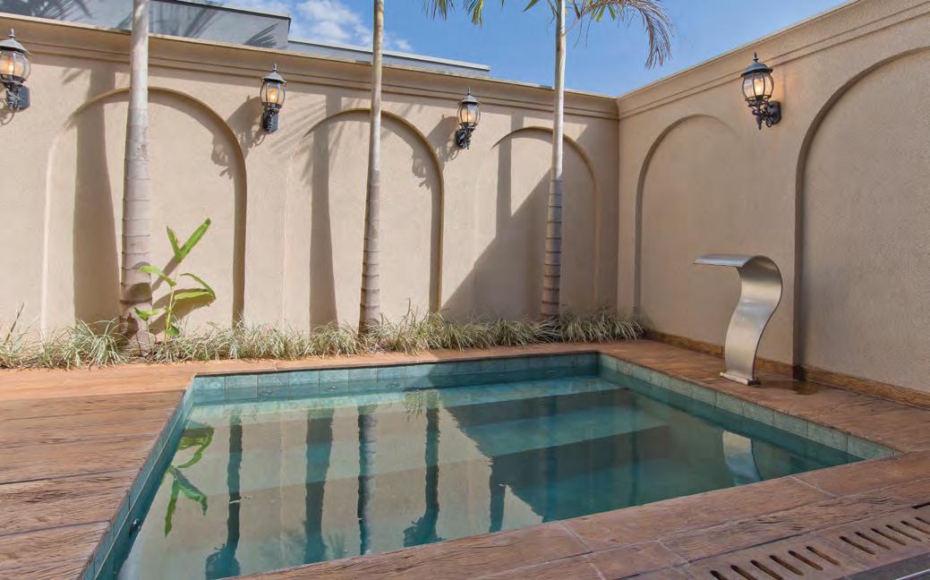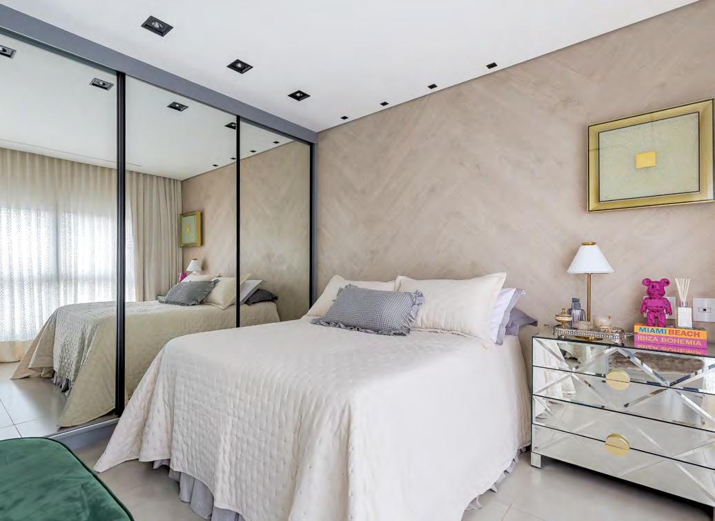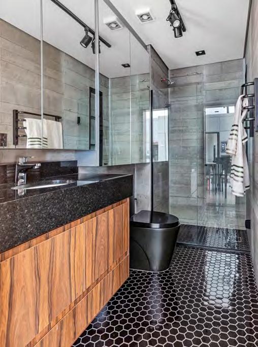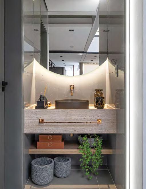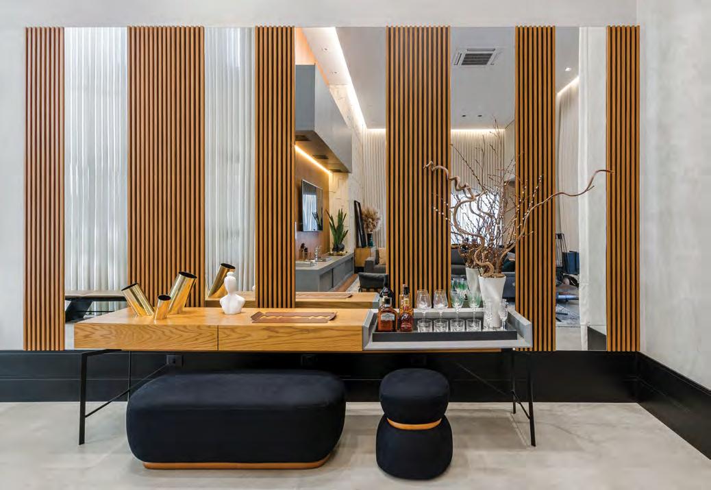 Na página anterior, os ambientes sociais têm piso vinílico (Condec Premium), paredes de tons neutros e esculturas, todas da Aimar Móveis, assim como o mobiliário solto. O quadro da Galeria La Insalata finaliza o décor. A marcenaria possui acabamento amadeirado, tons acinzentados e portas espelhadas. As cortinas de tecido garantem privacidade junto às portas (RN Esquadrias), na integração com a área externa. Nesta, a piscina foi renovada, com revestimento interno azul (Condec Premium) e equipamentos da A Pool Center Piscinas, que também forneceu o spa. O piso do entorno é de granito preto São Gabriel, inclusive no espaço gourmet, que tem paredes em porcelanato acinzentado da Condec Premium