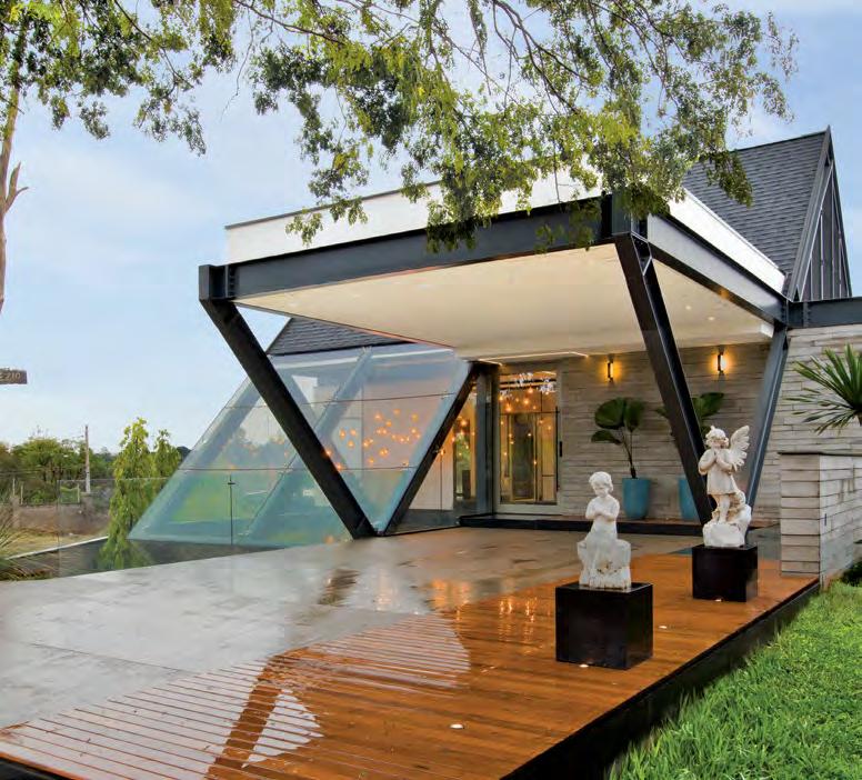 Quando se fala em arquitetura e construção, a tecnologia representa, hoje, uma aliada na busca por soluções sustentáveis. A partir de práticas inovadoras e conceitos versáteis, é possível edificar lares ecologicamente corretos, pensando no menor impacto ambiental possível. Nesta casa, o arquiteto Marcos Ávila inspirou-se no Centre Pompidou, na França, e nos trabalhos de Zanettini no Brasil, para atender aos desejos do cliente que queria uma residência com sistema a seco de construção. Outro pedido especial era o layout aberto, que ficasse em evidência no terreno irregular em formato de trapézio, onde a frente é mais estreita e o fundo mais largo. Assim, o profissional investiu em uma arquitetura moderna e um processo de construção que abarca métodos construtivos que ainda são novidade no mercado. Entre eles, se destaca a parte estrutural, toda em perfil de aço aparente com vigas da Gerdau em formato de “W” (Noroaço), com fechamento de paredes em steel frame (Ananda Metais), gesso acartonado e telhas Shingle para o telhado, todos da Saint Gobain, fornecidos pela Topping. Essas soluções não são apenas ecologicamente corretas, uma vez que representam menor desperdício de materiais e economia de tempo e recursos, como proporcionam conforto extra aos moradores.