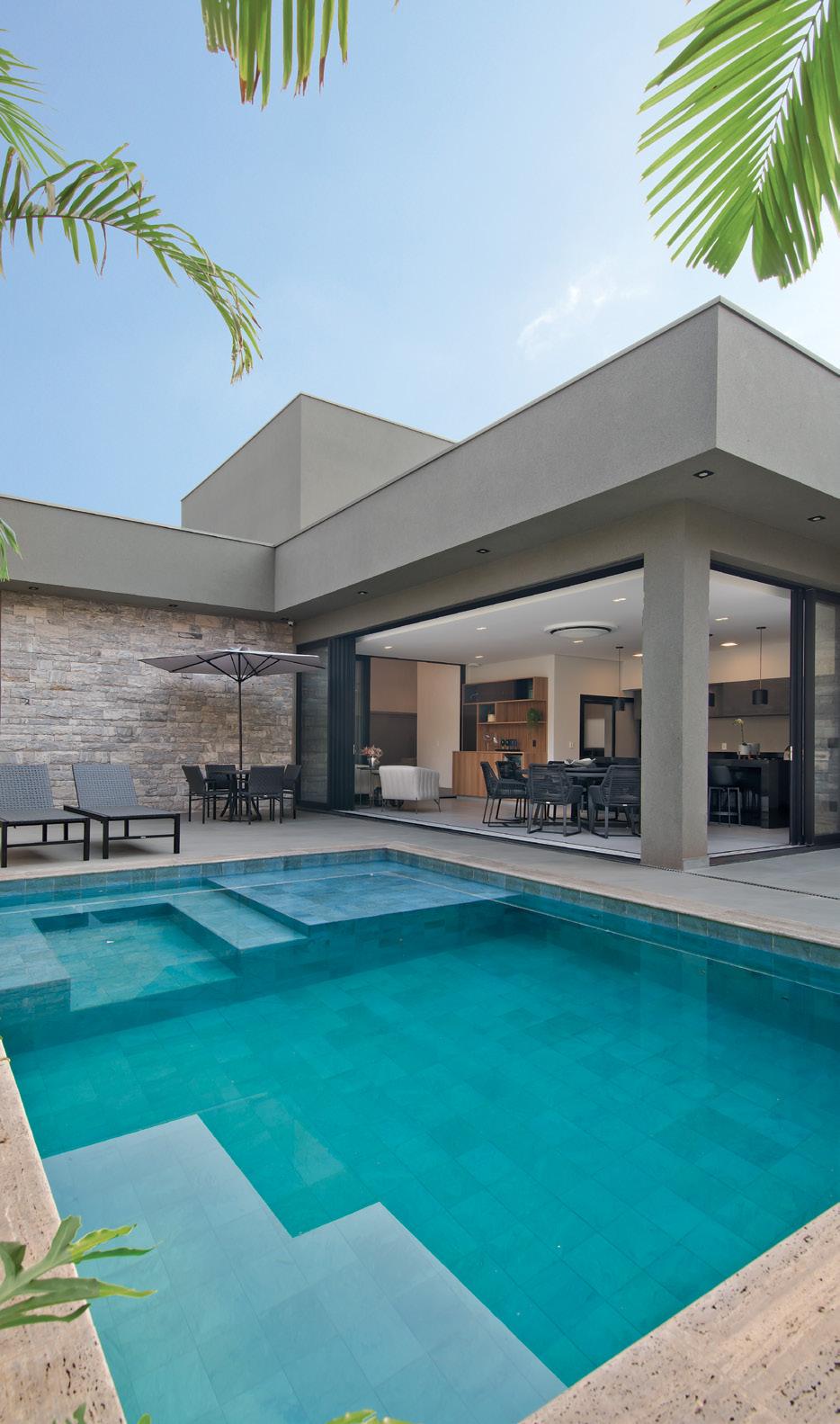 Com um visual moderno, esta casa destaca-se pela área de lazer acolhedora e integrada