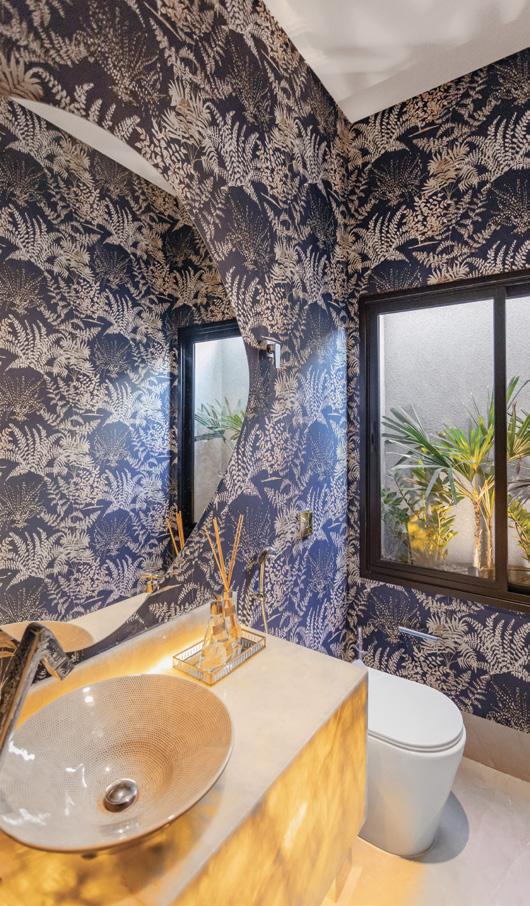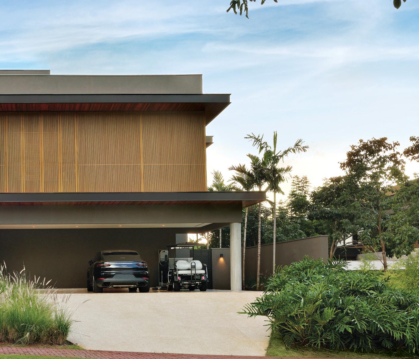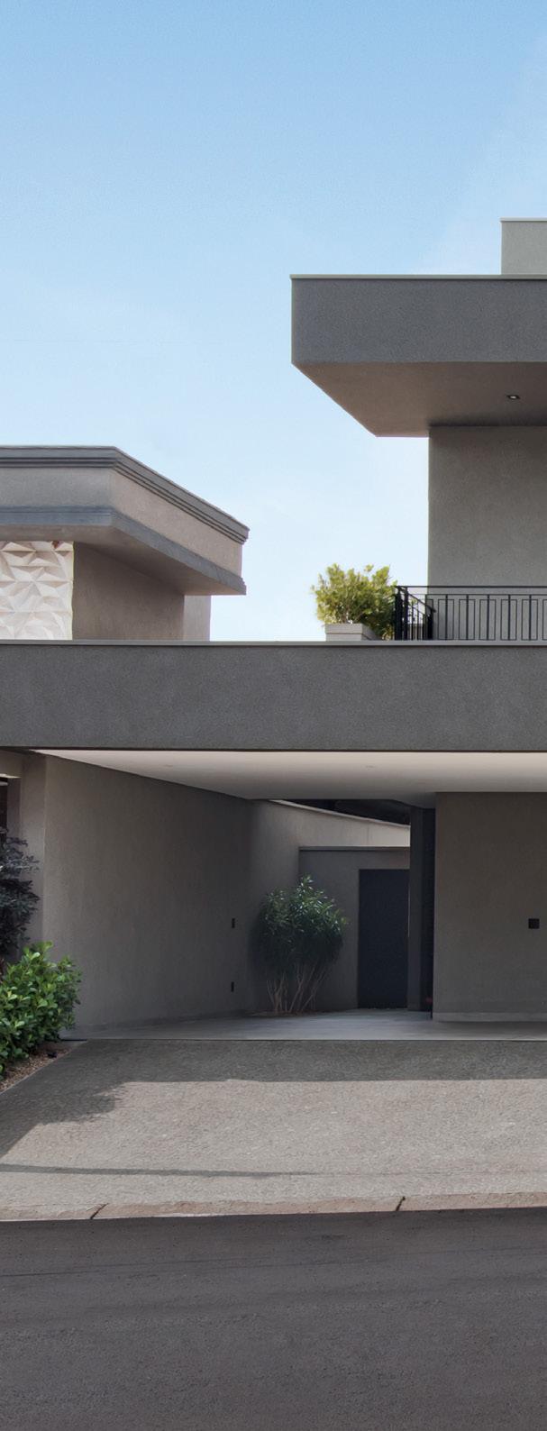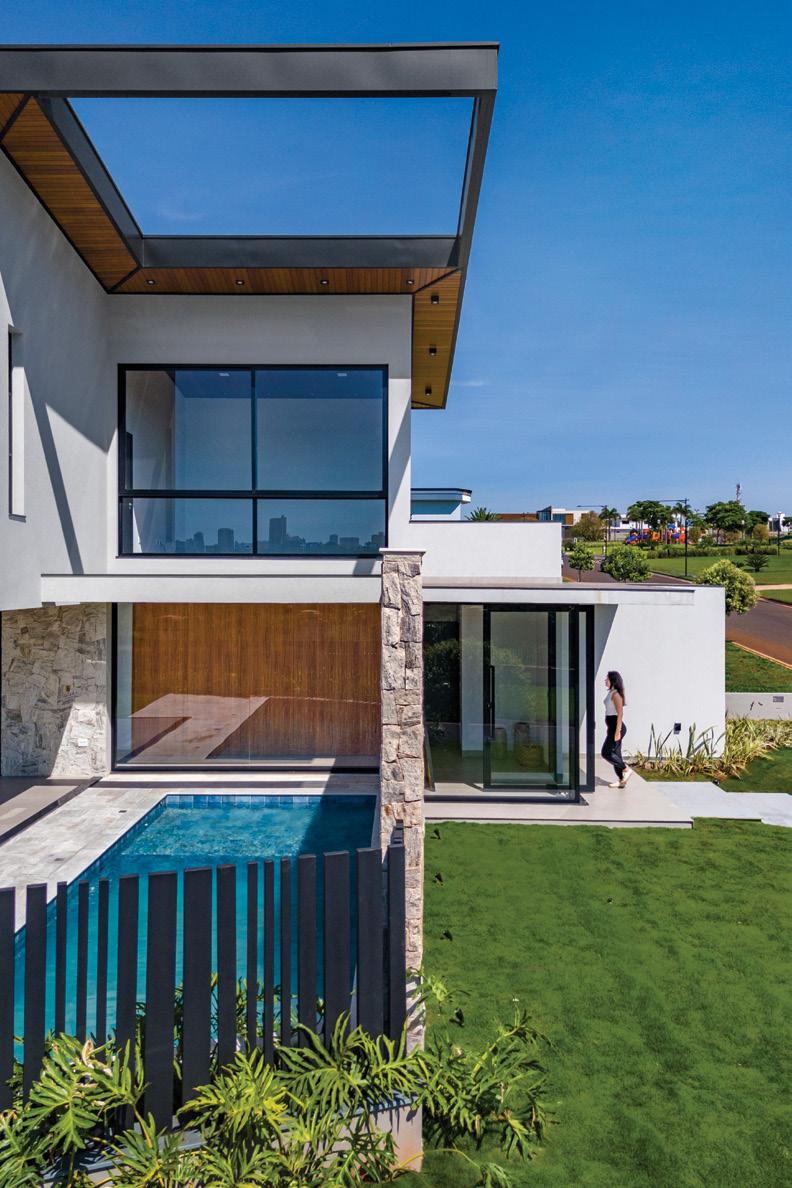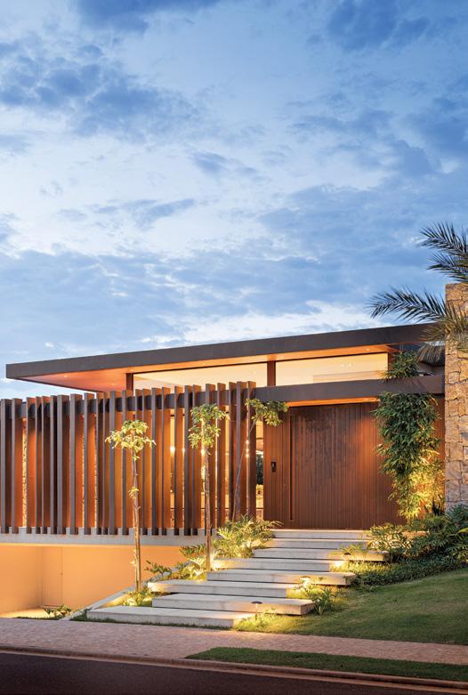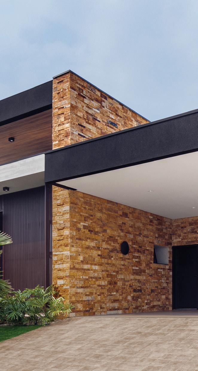 “Esta casa foi projetada com atenção a cada detalhe, combinando perfeitamente com o estilo de vida da família. O jardim da fachada contrasta com elementos rústicos, enquanto os ambientes internos se destacam pelo imponente pé-direito, que traz um toque de sofisticação. Todos os espaços visam facilitar a rotina familiar, com integração que promove o conforto e a funcionalidade.”
