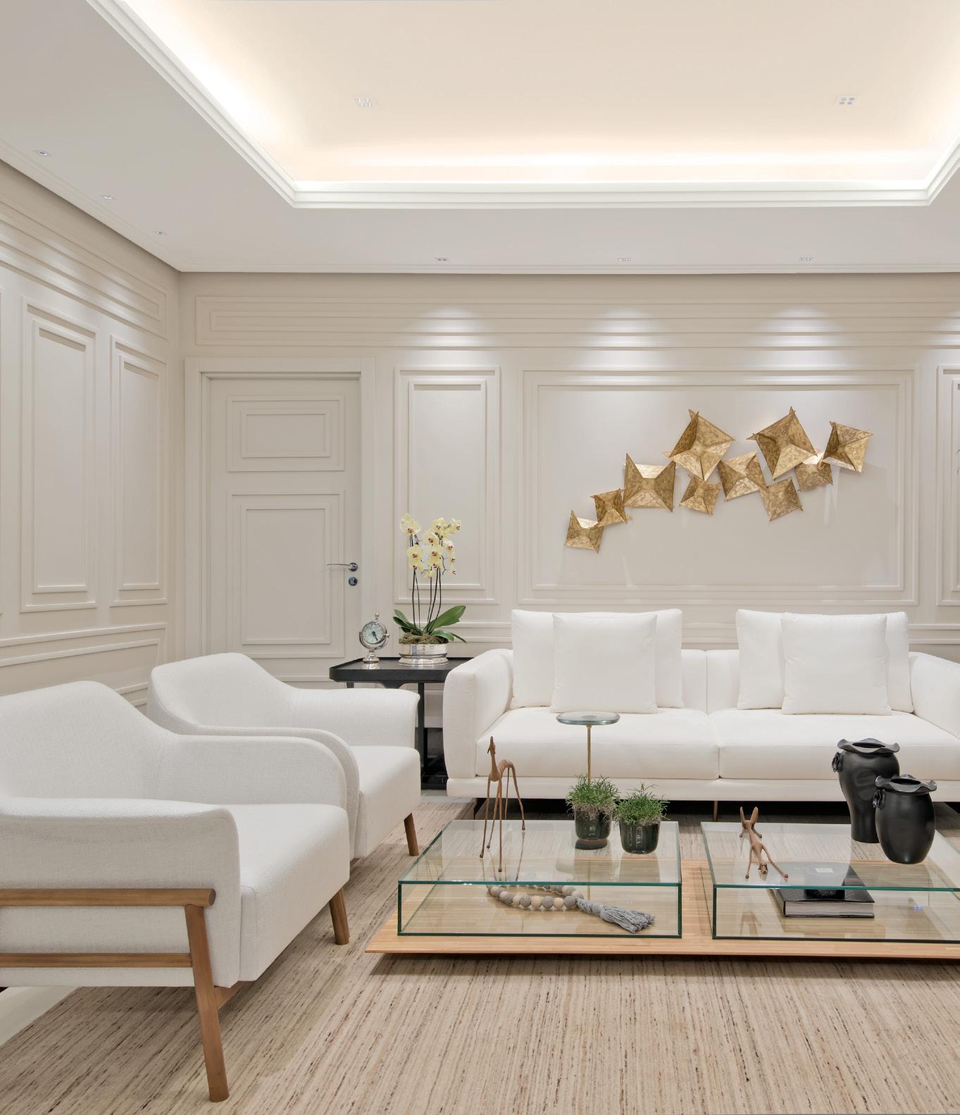 “Neste projeto, combinamos o estilo clássico desejado pelo cliente com a leveza do ambiente praiano. Ambientes amplos e bem definidos, tons neutros contrastando com madeiras escuras e estofados claros criam um equilíbrio sofisticado. A iluminação automatizada, com sancas e pendentes esculturais, realça os espaços. Destaques como a adega subterrânea e o living integrado ao gourmet refletem funcionalidade e personalidade.”