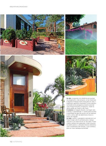 No alto, à esquerda, em referência aos quintais de antigamente, onde temperos, ervas medicinais e algumas hortaliças eram produzidas em casa, o engenheiro agrônomo Alexandre Furcolin apostou na tendência do paisagismo produtivo para dar vida à Praça Pomodoro & Peperone, criada na última edição da CasaCor São Paulo. O sistema de irrigação eficiente, da Irrigam (alto, à direita), é automatizado. O cliente pode escolher a quantidade de água de acordo com as espécies e com o clima, além de determinar a hora e o tempo de irrigação. Ao lado e acima, o paisagismo assinado por Luiz Felipe Rudge Leite foi pensado para o espaço reduzido e com desnível em um dos lados. Foram criados canteiros em patamares, onde é possivel ter jardins planos, e utilizados diversos elementos como revestimento das floreiras, o que contribuiu para um maior destaque da fachada