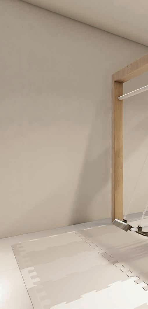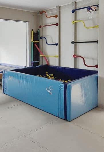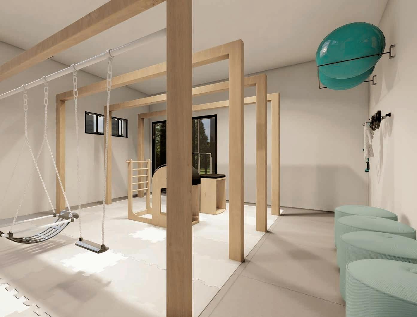 próprios adolescentes — espaços que favorecem a exploração corporal, a regulação emocional e o contato direto com práticas de cuidado e autonomia. Os ambientes internos foram projetados com rigor técnico: salas equipadas com recursos táteis, visuais e auditivos permitem intervenções sensoriais direcionadas e eficazes, adaptadas às necessidades de cada jovem. Na hidroterapia, a temperatura da água é controlada com precisão, enquanto os exercícios com flutuadores e resistência progressiva estimulam o fortalecimento muscular, o equilíbrio e a coordenação motora.