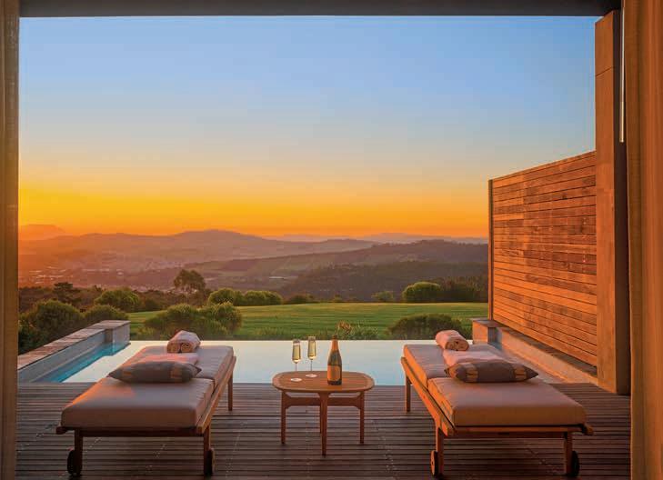 um dos pratos sofisticados servidos nos restaurantes da Delaire Graff Estate. Nesta, vista de um dos quartos da vinícola, com foco total na exclusividade e no bemestar. Acima e à direita, a piscina do Kruger Gate Hotel emoldurada pela savana. À direita, um dos espaços da Jordan, que une vinhos de terroir e uma vista deslumbrante