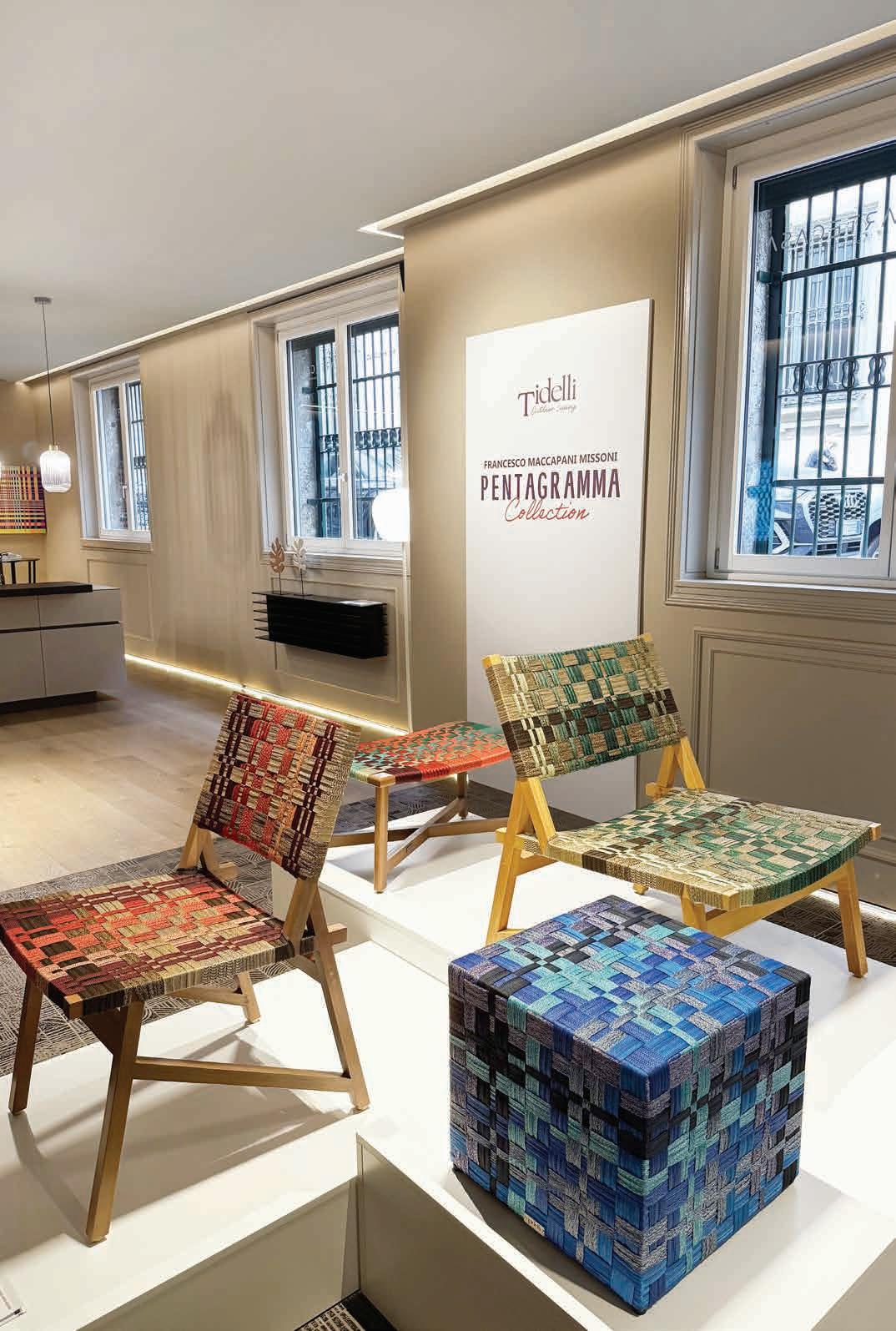 Nesta, a coleção Pentagramma, assinada por Francesco Maccapani Missoni para a Tidelli, transformou design em arte por meio de cores, tramas e estampas únicas. Os móveis da marca são encontrados na Perfilcasa Design. Na página ao lado, a poltrona Paese, assinada por Fabio Lima para a Venet Design, foi destaque no espaço Le Cavallerizze durante o Fuorisalone de Milão. Com formas acolhedoras e elegância atemporal, a marca está disponível na Jackie Móveis
