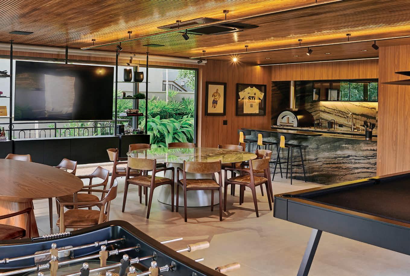 Nas fotos ao lado, o home theater, a brinquedoteca e uma das suítes de hóspedes, no térreo, revelam a essência do projeto, que é de acolhimento. Contemporâneos, os ambientes automatizados têm marcenaria minuciosamente planejada (DSilva Móveis Personalizados), com detalhes em mármore Travertino (Marmoraria São Jorge Jardinópolis). As esquadrias são da Olivaz Esquadrias