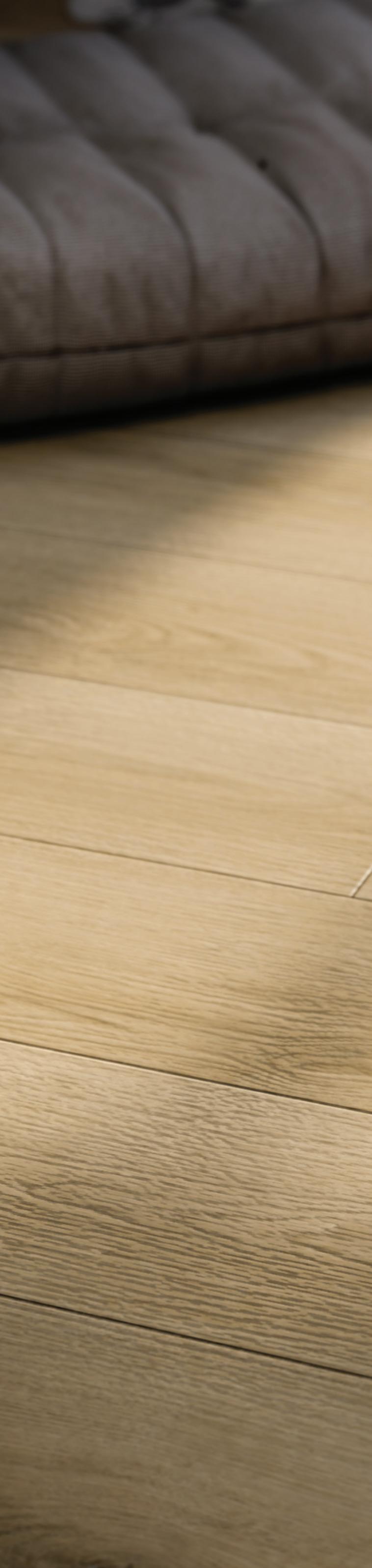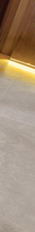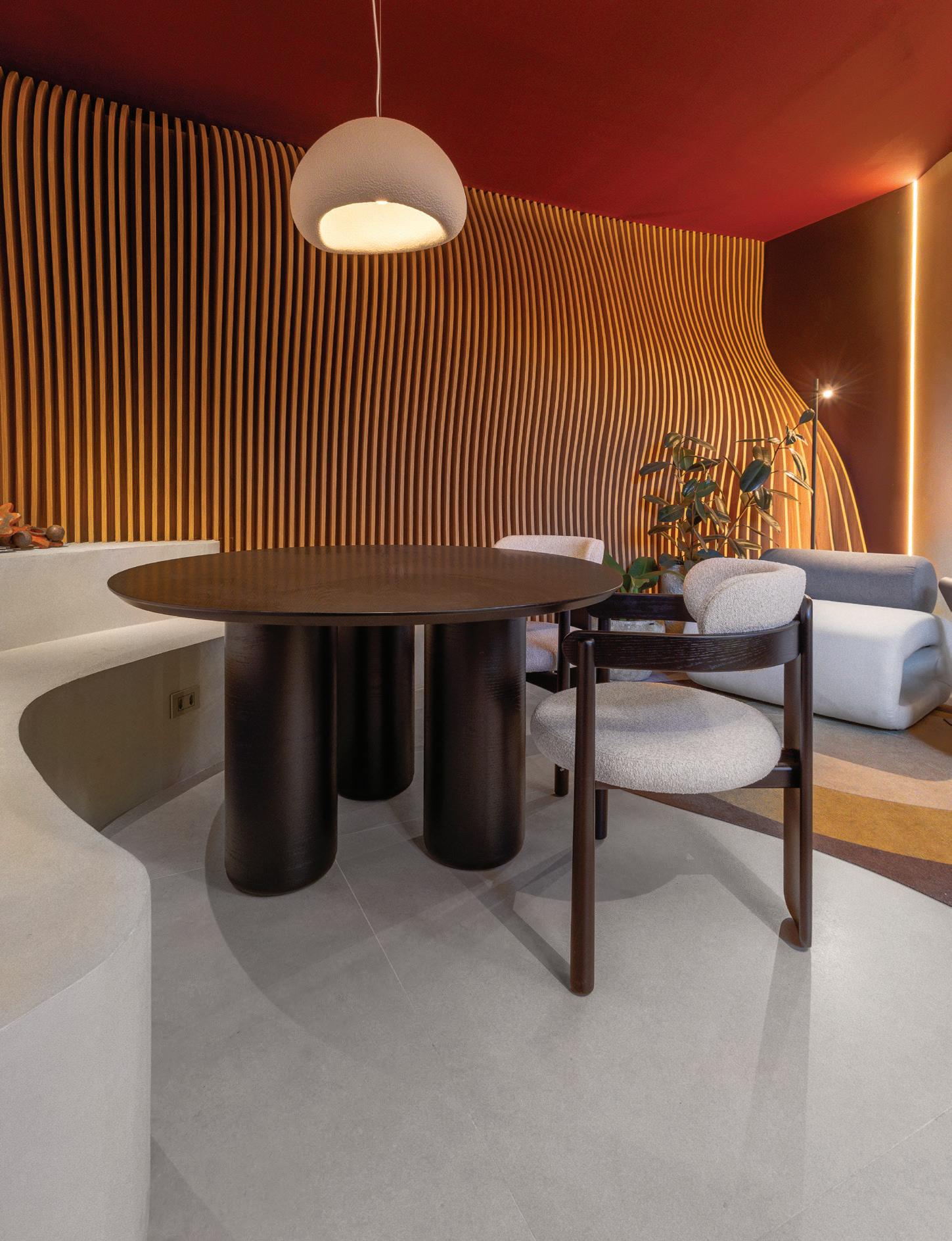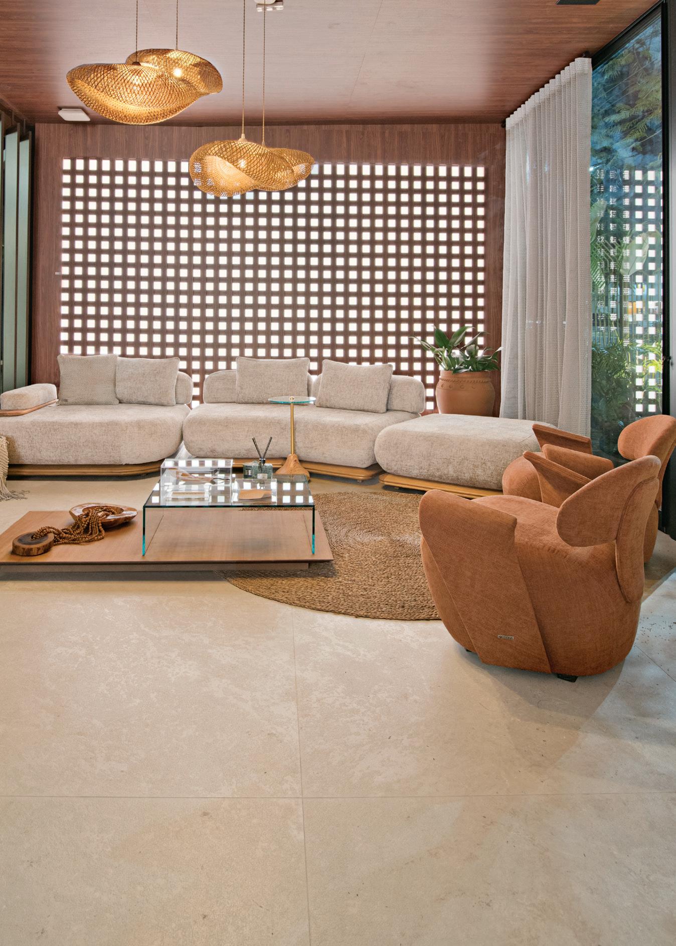 14 e 16 | Naira Araújo, ao projetar a “Casa Conceito”, utilizou o porcelanato Pietra Di Merapi Sabbia (Ref. 123057) no piso, que traz a robustez das pedras vulcânicas, criando um ambiente imponente e sereno. 15 | Luana Marques escolheu o porcelanato Ceratto Carvalho (Ref. 200006) para o “Refúgio Allma”. Sua superfície natural evoca a beleza da madeira.