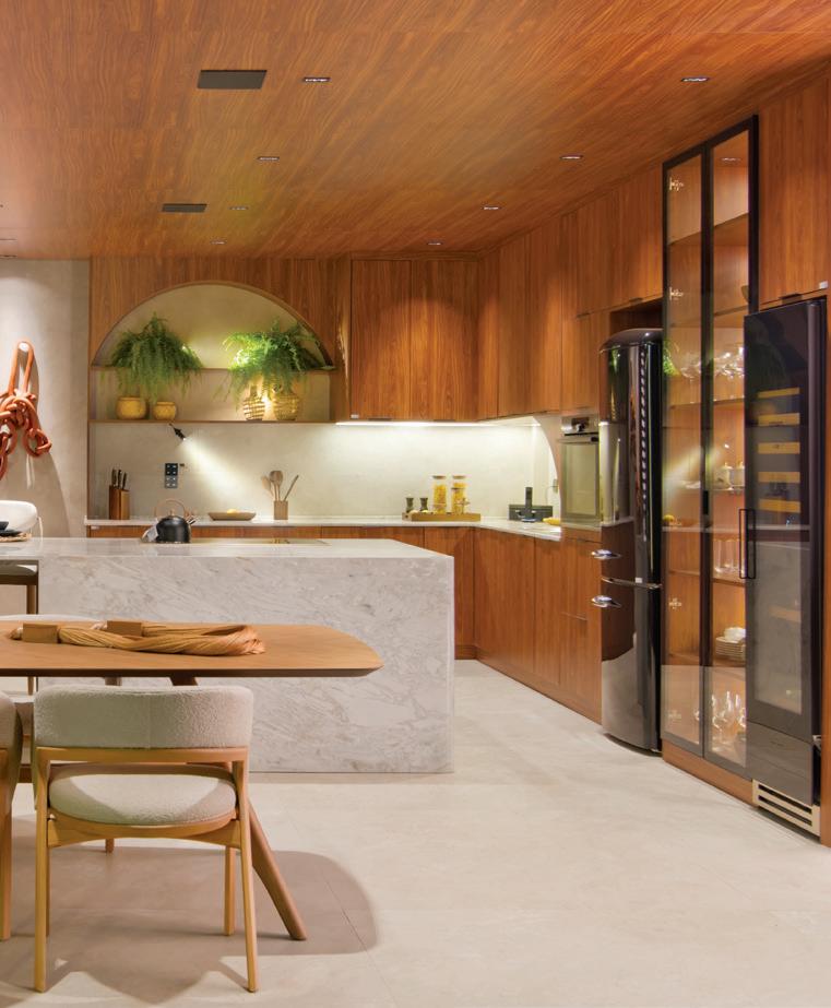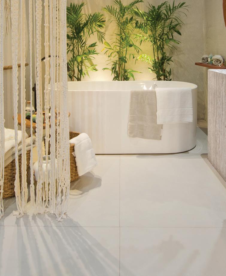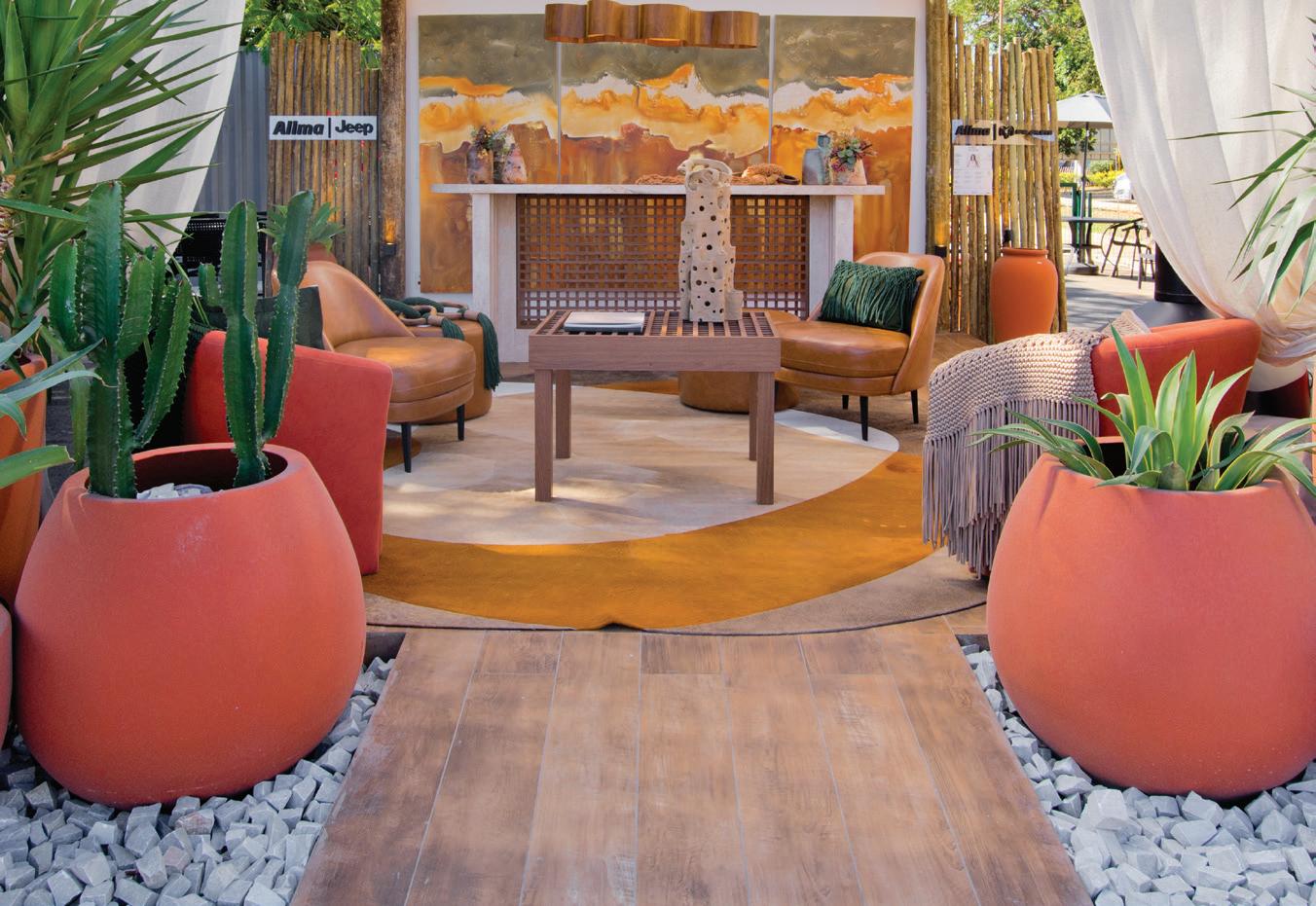 14 e 16 | Naira Araújo, ao projetar a “Casa Conceito”, utilizou o porcelanato Pietra Di Merapi Sabbia (Ref. 123057) no piso, que traz a robustez das pedras vulcânicas, criando um ambiente imponente e sereno. 15 | Luana Marques escolheu o porcelanato Ceratto Carvalho (Ref. 200006) para o “Refúgio Allma”. Sua superfície natural evoca a beleza da madeira.