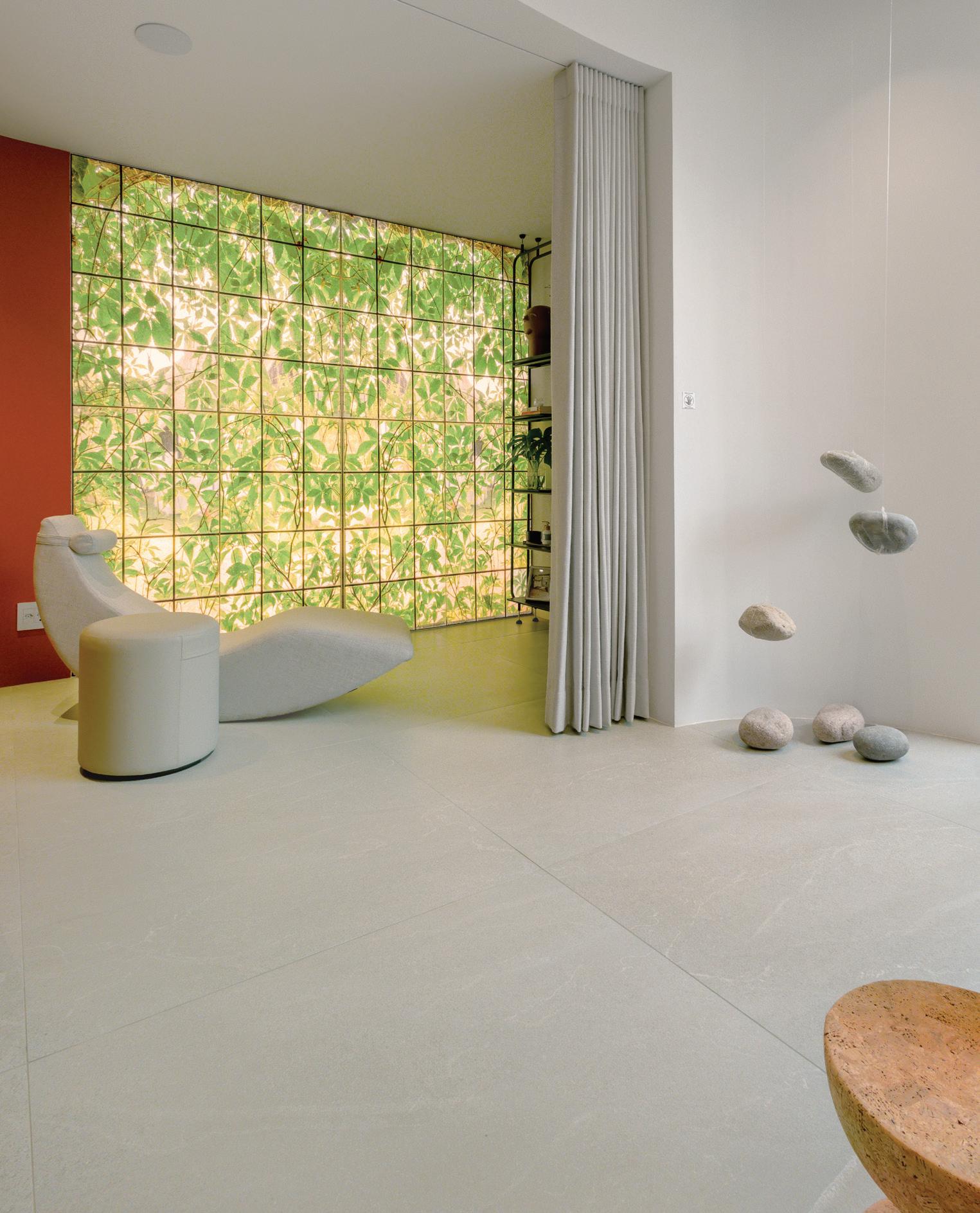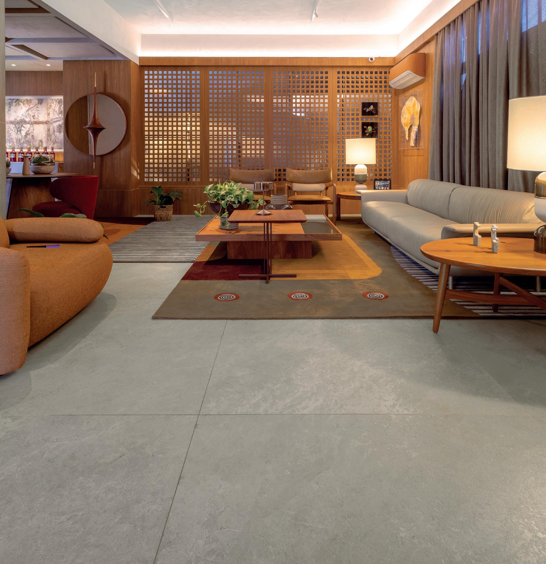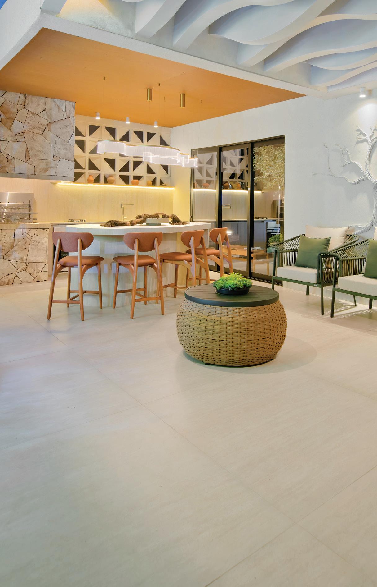 05 e 06 | Para o piso do espaço “Reconecta”, os profissionais Joel Pereira, Marina Moro e Viviane Cantarino utilizaram o porcelanato Val Gardenia Grigio (Ref. 108060). Com formato de 108x108 cm, sua superfície Natural SAP oferece resistência superior, tornando o ambiente funcional para espaços de alto tráfego. 07 | No “Restaurante Brisa” assinado por Carina Rezende e Maísa Andrade, o porcelanato Zen Orvalho (Ref. 123065) foi a escolha para o piso. Inspirado no movimento das pedras nos jardins zen japoneses, traz a essência da natureza para os interiores. 08 | Paola Cimarelli Landgraf escolheu o porcelanato Pietra Di Merapi Sabbia (Ref. 123057) para o piso do “Living Design”. Com a robustez das pedras vulcânicas, o produto traz um toque escultural e imponente aos espaços. 09 | Wallace Oliveira, ao criar a “Varanda Aconchego”, apostou no porcelanato Shizen (Ref. 108071), ideal para áreas externas.