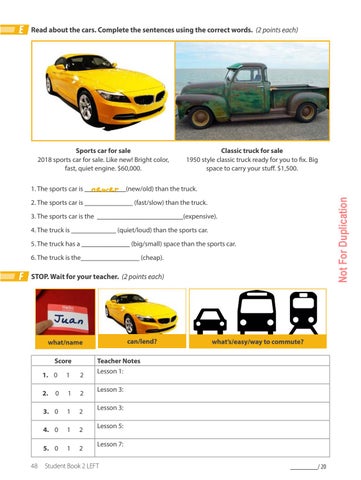 1. The sports car is ____________(new/old) than the truck. newer 2. The sports car is ______________ (fast/slow) than the truck. 3. The sports car is the _________________________(expensive). 4. The truck is _____________ (quiet/loud) than the sports car. 5. The truck has a ______________ (big/small) space than the sports car. 6. The truck is the_________________ (cheap).