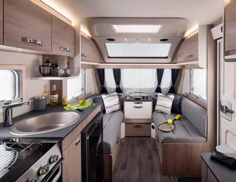Mondial SE byder på et elegant og rummeligt køkken med et eksklusivt komfur med gasovn og grillfunktion. Ultra Heat, dobbelte USB-udtag og radio med Bluetooth gør det nemt at skabe den rette stemning til hyggelige aftener. Det moderne, lyse interiør med hvide køkkenoverskabe giver en åben og indbydende rumfornemmelse. Opvarmning og isolering er i højeste klasse 3, hvilket sikrer en behagelig temperatur i vognen – selv på kolde vinterdage.