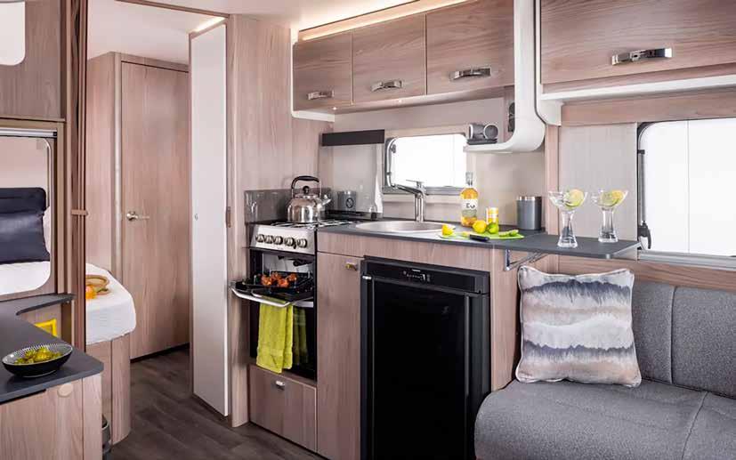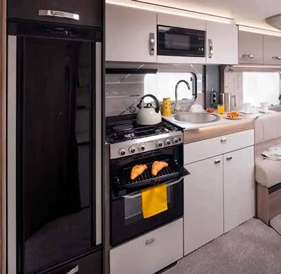 Komfuret består af tre gasblus og en elektrisk kogeplade, samt en bageovn med grillfunktion. Hertil kommer mikrobølgeovn og et rummeligt Slimline-køleskab på 133 liter med 14 liters fryseboks. Komfur og ovn er placeret modsat forteltet, så varmen effektivt kan ledes ud i det fri.