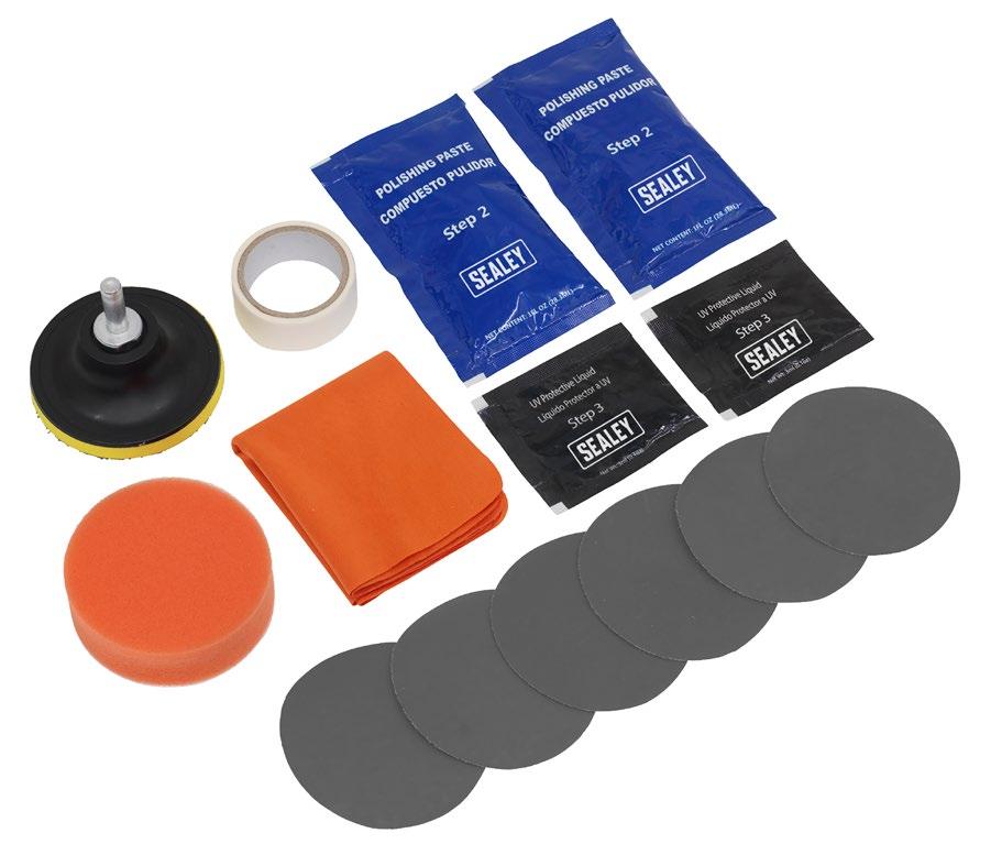 Narzędzie do regeneracji reflektorów, zawiera pastę polerską, papiery ścierne, gąbkę, tarczę na rzep z trzpieniem, taśmę maskującą, płyn ochronny