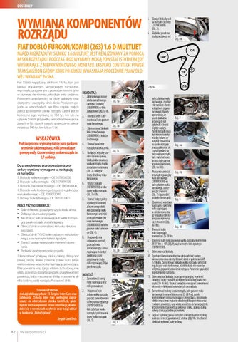 NAPĘD ROZRZĄDU W SILNIKU 1.6 MULTIJET JEST REALIZOWANY ZA POMOCĄ PASKA ROZRZĄDU I PODCZAS JEGO WYMIANY MOGĄ POWSTAĆ ISTOTNE BŁĘDY WYNIKAJĄCE Z NIEPRAWIDŁOWEGO MONTAŻU. EKSPERCI CONTITECH POWER TRANSMISSION GROUP KROK PO KROKU WYJAŚNIAJĄ PROCEDURĘ PRAWIDŁOWEJ WYMIANY PASKA. Fiat Doblò napędzany silnikiem 1.6 Multijet jest bardzo popularnym samochodem transportowym wykorzystywanym z powodzeniem nie tylko DEMONTAŻ: w biznesie, ale również jako duże auto rodzinne. 1. Zdemontować osłonę Powodem popularności są duże gabaryty oraz z koła zamachowego elastyczny i oszczędny silnik diesla. Producent poi umieścić blokadę jazdu w samochodach bez filtra cząstek stałych (186089000) w koło zaleca sprawdzenie paska rozrządu i jeżeli jest to zamachowe (Zdj. 1a-d). konieczne jego wymianę co 150 tys. km lub po 2. Odkręcić śruby i zdeupływie 5 lat. W przypadku samochodów wyposamontować koło pasowe żonych w filtr cząstek stałych, sprawdzenie zalecawału korbowego. ne jest co 140 tys. km lub co 5 lat. 3. Zdemontować blokadę koła zamachowego (186089000) z koła zamachowego. Podczas procesu wymiany należy poza paskiem 4. Ustawić położenie rozrządu na oznaczenia. wymienić także napinacz, rolki prowadzące i pompę wody. Czas wymiany paska rozrządu to 5. Rozłączyć wtyczkę czujnika ciśnienia paliwa, 2,7 godziny. tak by śruba obudowy wałka rozrządu mogła Do prawidłowego przeprowadzenia prozostać zdemontowana cedury wymiany wymagane są następują(Zdj. 2). Odkręcić ce narzędzia: śruby obudowy wału 1. Blokada wałka rozrządu – OE 1870836000 korbowego. 2. Blokada wałka rozrządu – OE 1870896900 6. Włożyć blokadę 3. Blokada koła zamachowego – OE 1860898000 (1870896900) w obu4. Blokada wału korbowego/przyrząd regulacyjny dowę wałka rozrządu wału korbowego – OE 2000003000 (Zdj. 3a i 3b). 5. Uchwyt koła zębatego – OE 1870815000 7. Usunąć śruby z pokrywy skrzyni korbowej PRACE PRZYGOTOWAWCZE: z lewej strony obok Zidentyfikować pojazd przy użyciu kodu silnika. koła pasowego wału Odłączyć akumulator pojazdu. korbowego i umieścić przyrząd regulacyjny Nie obracać wału korbowego lub wałka rozrządu, wału korbowego gdy pasek rozrządu został ściągnięty. (2000003000) na koło Obracać silnik w normalnym kierunku obrotów pasowe wału korbowe(w prawo). go (Zdj. 4). Obracać silnik TYLKO kołem zębatym wału korbo8. Po sprawdzeniu wego, a nie na innymi kołami zębatymi. ustawienia rozrządu, Zwrócić uwagę na wszystkie momenty dokręprzyrząd może cania. zostać usunięty i rolka Podnieść i podeprzeć przód pojazdu. napinająca może być zwolniona przez Zdemontować pokrywę silnika, osłonę dolną oraz poluzowanie śruby prawą osłonę silnika, przednie prawe koło, pasek rolki napinającej. Zdjąć wielorowkowy wraz z rolką napinającą i prowadzącą, pasek rozrządu. filtra powietrza wraz z jego wlotem z obudowy, rurę wlotu powietrza do turbosprężarki, przepływomierz powietrza, śruby mocowania silnika, mocowanie sil- MONTAŻ: 1. Zamontować nową nika i osłonę paska rozrządu. Podeprzeć silnik. rolkę napinającą oraz rolki prowadzące. Szanowni Państwo, 2. Poluzować koło z okazji zbliżających się 15 Targów Inter Cars oraz zębate wałka rozrządu, jubileuszu 25-lecia Inter Cars serdecznie zaprapoprzez zamontowanie szamy do odwiedzenia stoiska ContiTech, gdzie uchwytu koła zębatego będzie można wymienić cenne informacje, dowie(1870815000) na dzieć się o nowościach w ofercie oraz wziąć udział kole zębatym wałka w konkursie „MotoExplorer”. rozrządu i poluzowanie śruby wałka rozrządu Zespół ContiTech (Zdj. 5).