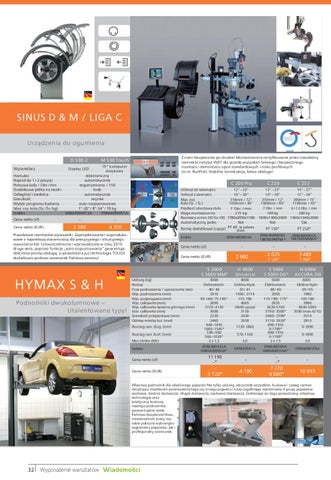 SINUS D & M / LIGA C Urządzenia do ogumienia D 530-2 Wyświetlacz Hamulec Najazd do 1 i 2 pozycji Pokrywa koła / Obr./min Dodatkowa półka na stożki Odległość i średnica Szerokość Wybór programu badania Max. roz. koła (Sz./Śr./kg) Indeks Cena netto (zł) Cena netto (EUR)