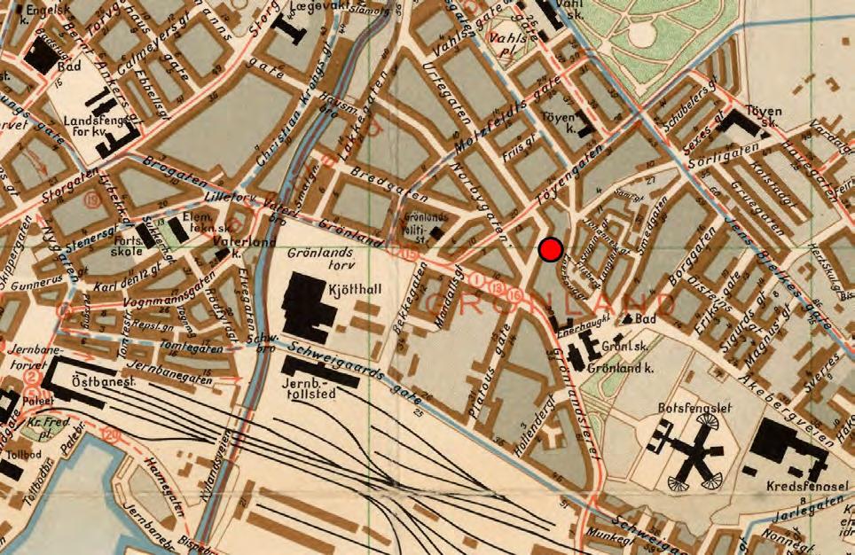 ↙ Platous gate 2 avmerket på kart over Grønland fra 1938, der Harald bodde fra han var 4 år i 1912. KART: OSLO BYARKIV.