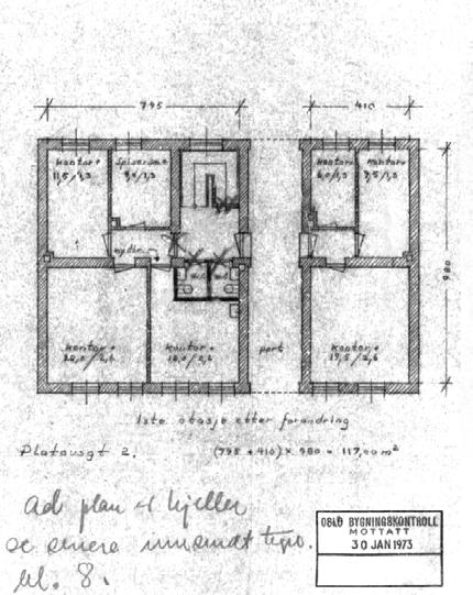 → Plan av første etasje i Platous gate 2. Her bodde Harald og familien på to rom og kjøkken i den lille leiligheten på bare 40 kvadratmeter til høyre for porten. TEGNING: OSLO PLAN- OG BYGNINGSETAT.